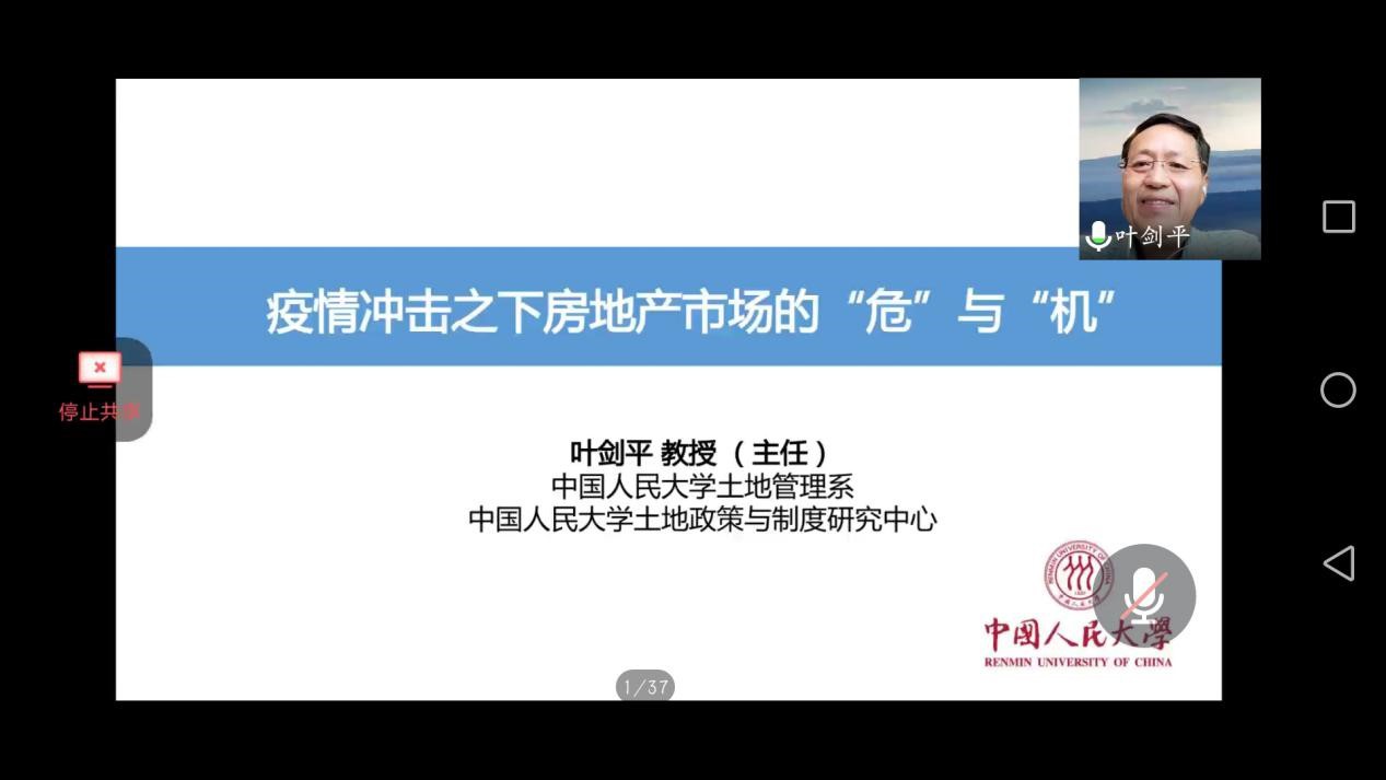 2020年6月28日上午9:30,中国人民大学土地管理系、中国人民大学土地政策与制度研究中心叶剑平教授(主任)学术讲座《疫情冲击之下房地产市场的 “危”与“机”》于线上成功举办。四川大学公共管理学院刘润秋教授主持了此次讲座,土地资源与房地产管理系董欢副教授、赵茜宇副研究员出席了此次讲座,土地资源管理专业研究生及本科生参加了此次讲座。