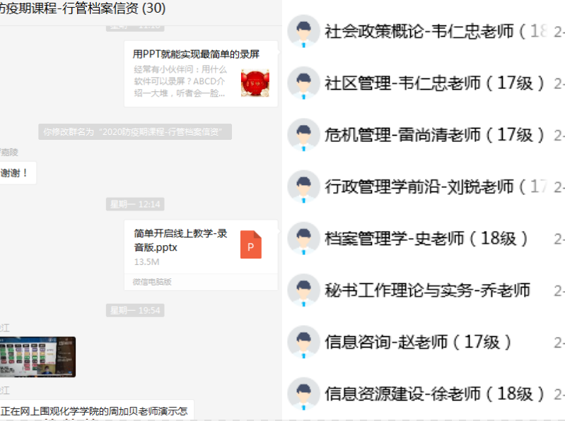 又如史江教授所授的《档案管理学》课程,史江教授采用腾讯课堂极速版语音直播+QQ群分组讨论多形式结合的方式展开教学。她使用了一台联想笔记本电脑和一个耳机,一个华为手机和手机托板,电脑和手机同时上线,预先在电脑桌面建一个文件夹放上课用的腾讯课堂极速版软件、课程PPT、资料、图片、小视频等。她利用腾讯课堂邀请码正式开启课堂,通过屏幕分享、语音讲述、QQ群二次分组讨论、课后反馈调查等环节将第一堂课流利顺畅的完成。在课程结束后,她立即编写第一次线上教学经验,面向学校、学院同事QQ群分享交流,为院内外同事提供了宝贵的经验。