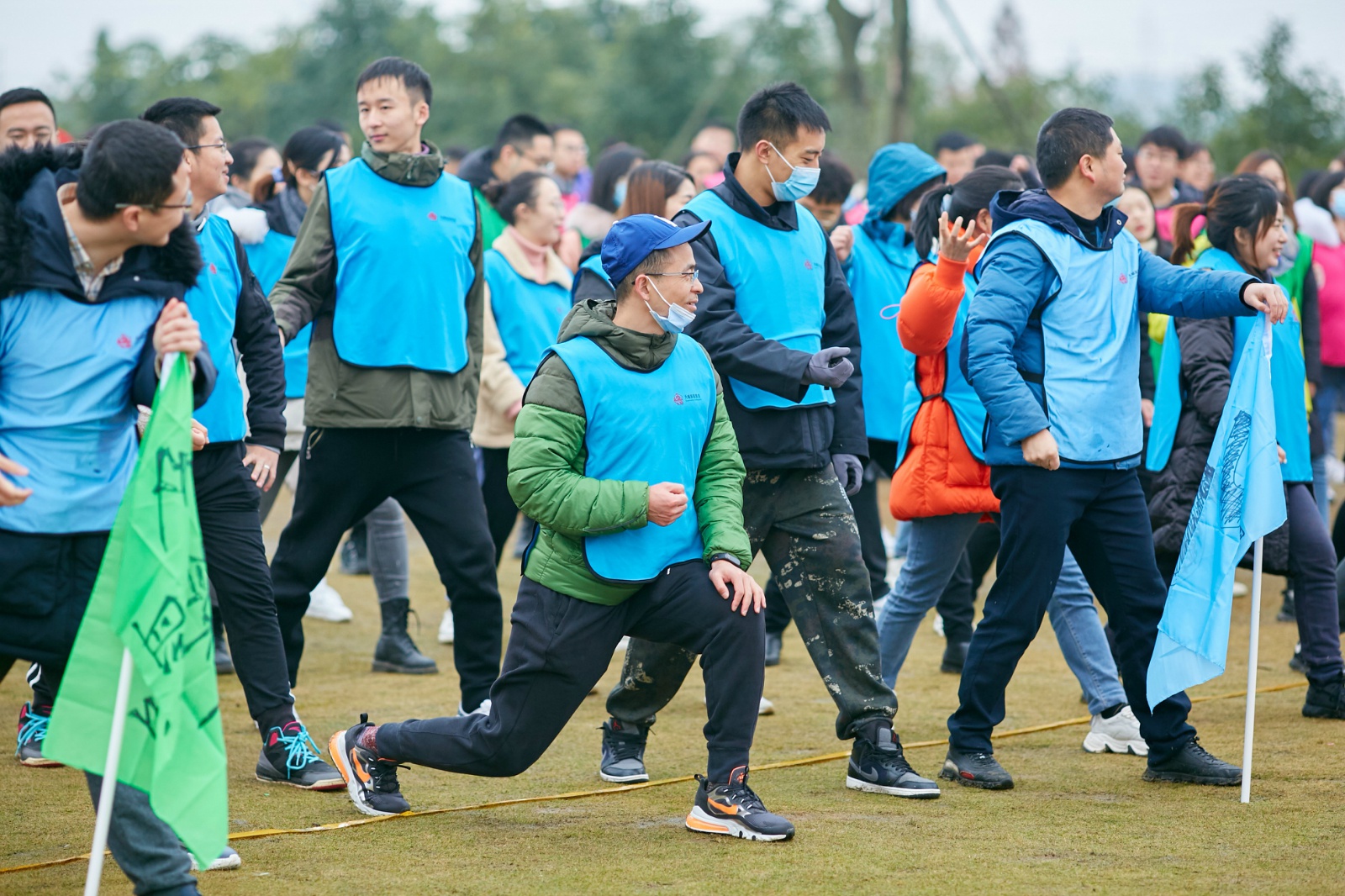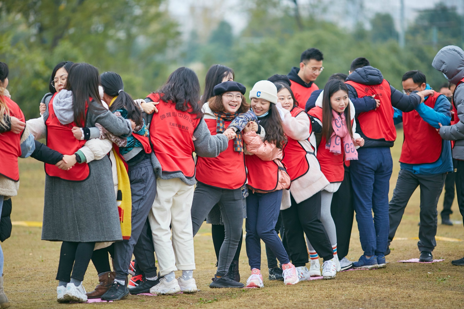 全体师生于9:30抵达三圣乡素拓基地,在教练员的组织下以班级为单位快速集合,用一系列破冰游戏,如“重击后背”、“勾肩搭背”等,极大地调动了学生们积极性,让本有些拘谨的同学们迅速融入到热烈而欢快的气氛中。随后,打乱班级方阵重新团队组建,在队长的带领下各队群策群力:选团名、画队旗、编口号,组成了“天下第一队”、“青青草原队”、“粉红玫瑰队”等8支队伍,将活动推向另一高潮。寒风中,在教练的带领下,各队在一片欢呼声中跳起了热身舞,“拖拉机”、“刀削面”、“扯面条”在欢乐简洁的舞动韵律当中,冰冷气氛慢慢融化,笑容逐渐浮上脸庞,整体氛围和谐而愉悦。