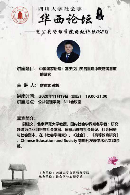 2020年11月19日晚上19:00,四川大学社会学华西论坛系列讲座第十期——暨公共管理学院格致讲堂002期于公管院311成功举行。北京师范大学社会学系教授尉建文发表了题为“中国国家治理:基于汶川灾后重建中政府满意度的研究”的演讲。讲座由四川大学社会学与心理学系马缨研究员主持,二十余名同学参与了此次讲座。