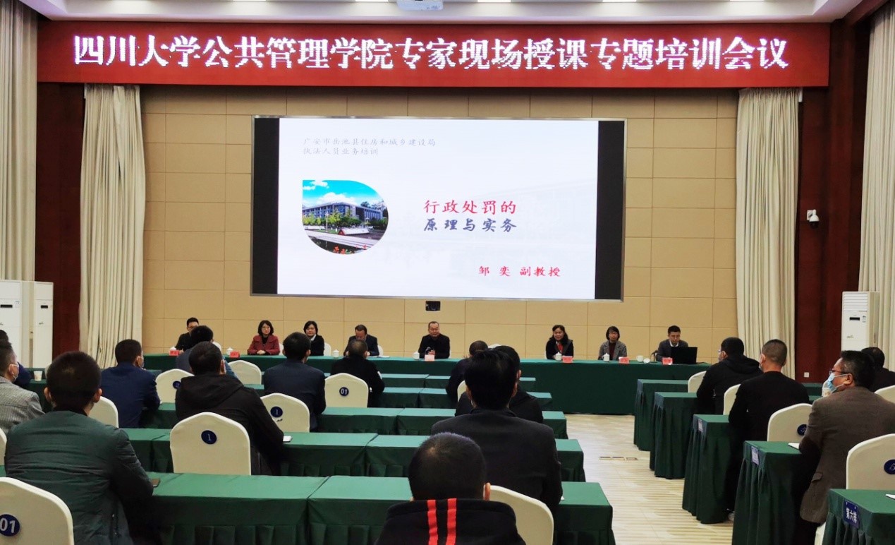 2020年11月2日,公共管理学院院长史云贵率队赴岳池县开展定点扶贫工作,学院党委委员何玲、学院纪委委员兼教师党支部书记陈丽、工会主席刘玲、专职组织员廖海燕、学生党支部书记周锐参加了扶贫工作。公共管理学院特邀专家、法学院副教授邹奕对岳池县住房及城乡建设局60多位战斗在一线的执法人员开展了能力素质培训。