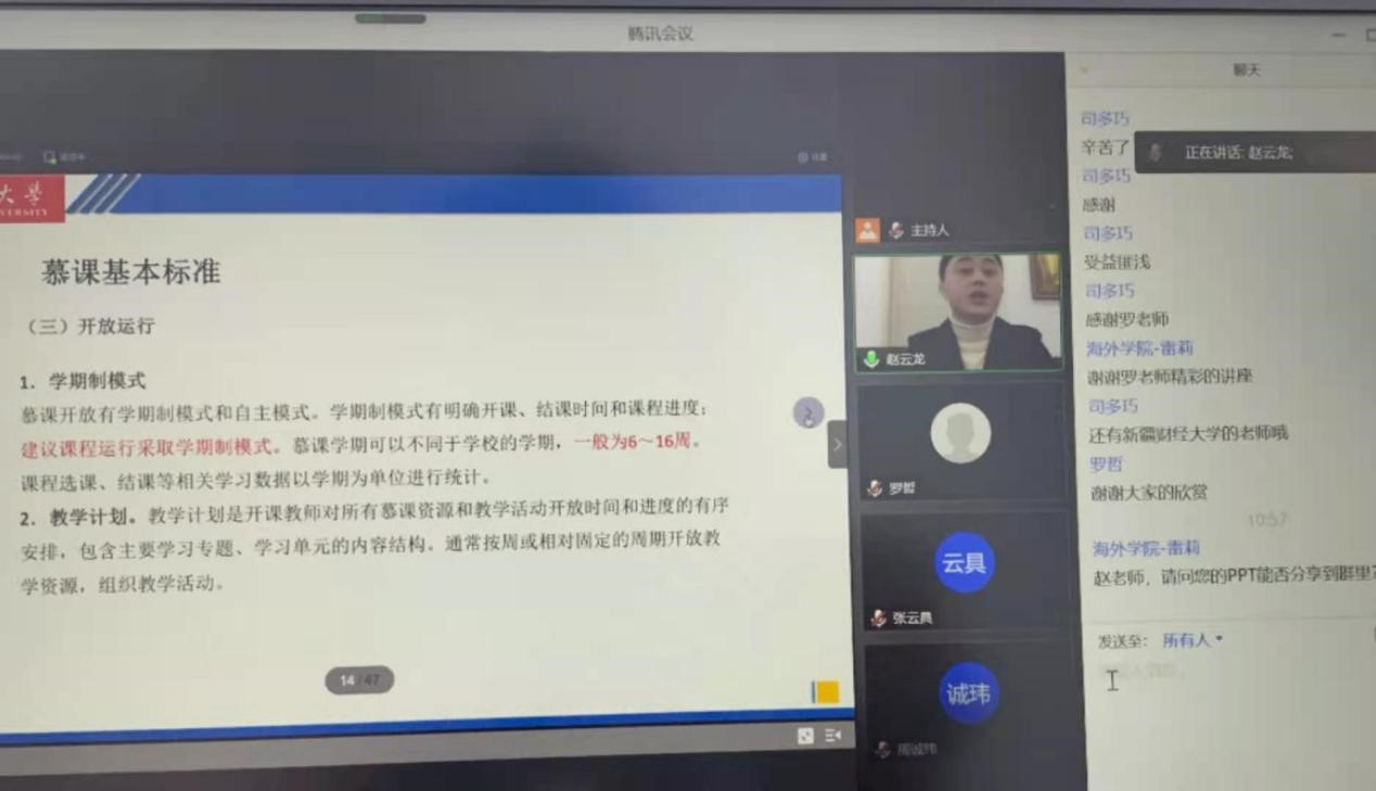 2020年12月25日上午,公共管理学院特别联合智慧树团队成功举办了线上线下结合的教师教学能力发展活动——“一流课程建设经验分享会”,旨在响应教育部实施一流本科课程“双万计划”的号召,大力推动我院新一批具有川大特色和水平的一流课程建设与申报工作。本次分享会由公共管理学院罗亚玲副院长主持,特别邀请了国家首批一流课程《人力资源管理》负责人罗哲教授及智慧树团队赵云龙和周诚玮两位嘉宾进行分享。会议不仅为我院教师们交流互动搭建了平台,还吸引到了校内外兄弟学校和学院教师们的积极参与。