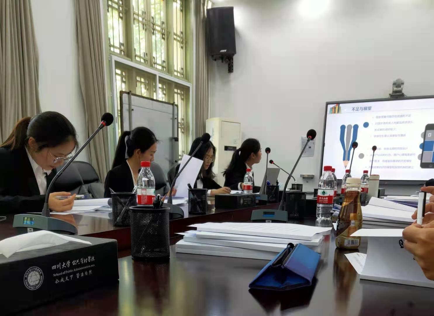 答辩现场严格按照四川大学硕士学位论文答辩会的程序和要求进行。答辩会正式开始后,先由答辩学生对论文的选题原因、研究意义、主要研究发现、创新与不足、盲审专家意见修改情况等做陈述。之后由答辩专家依次点评、提问和提出细致详细的修改意见,答辩同学对每位专家提出的问题都认真地逐一回应,对他们指出的不足和修改意见也虚心接受。