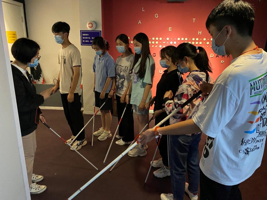 在场馆内,参与体验的同学分小组在一名视觉障碍导赏员的引导下,在全黑暗的环境中探索马路、超市、茶馆等不同的生活场景。在这一过程中,参与者必须突破自己的焦虑与迷茫,适应一个完全陌生的世界。