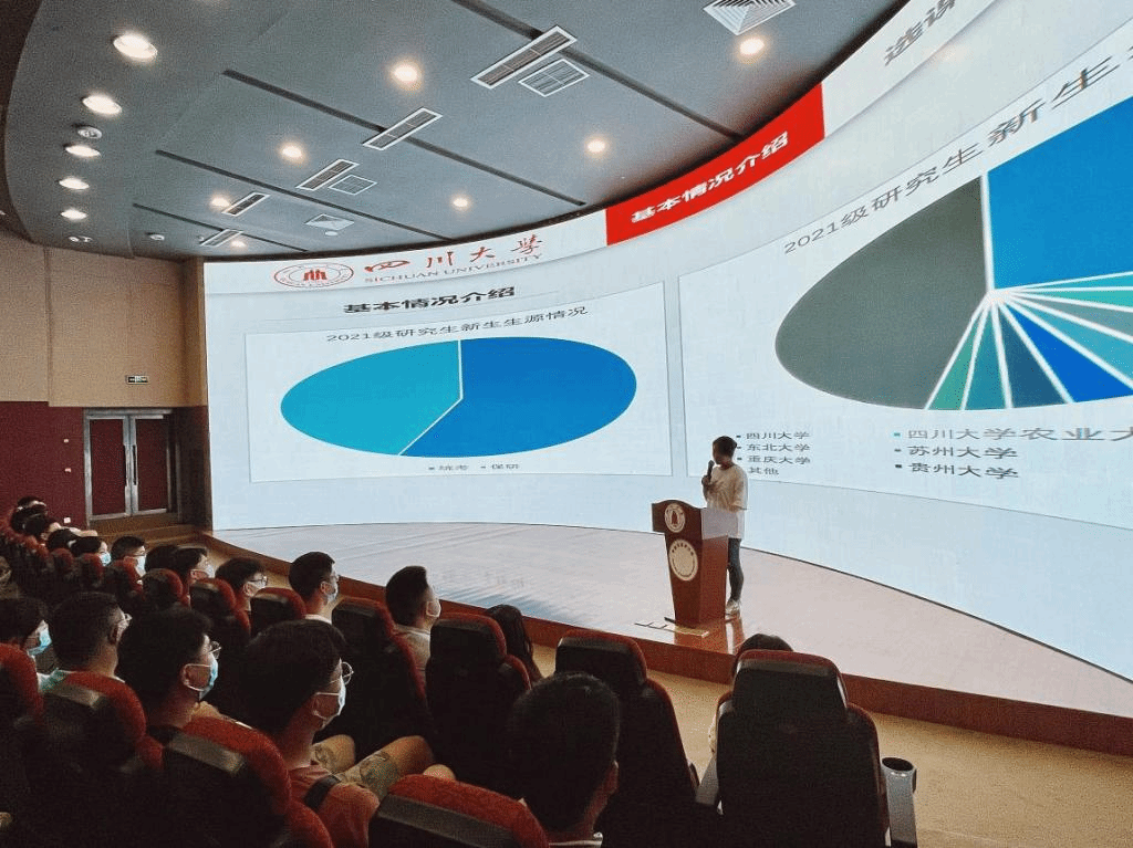 在教育大会的第一部分,林晨老师首先分别从新生的性别、年龄、政治面貌、录取方式、专业人数等方面向同学们介绍了基本情况,进一步,介绍四川大学的校史及学校与同学相关的基本情况。