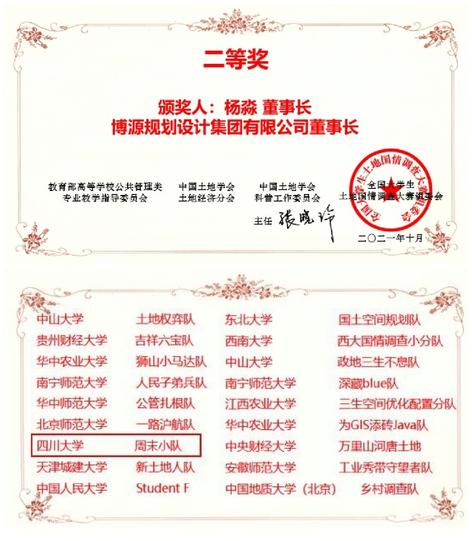 在赵茜宇副教授、唐鹏副教授的指导以及特聘副研究员饶永恒等土管系老师的支持下,由我院土管系2019级本科生廖珊、黄思睿、于新月、李佳怡组成的队伍,完成《公园城市乡村表达的综合效益评价——以成都市郫都区为例》调查报告,经过激烈的竞争进入决赛,并通过现场汇报和答辩中的优异表现,获得“二等奖”的荣誉。此外,由我院土管系2019级本科生曹懿璇、谢博宇、陈烨、刘昊、肖子帆组成的队伍也凭借《同城化发展背景下,“成德眉资”国土空间利用效率评价》调查报告,探讨同城化的背景下成德眉资国土空间利用效率及协同程度,荣获“优秀作品奖”。