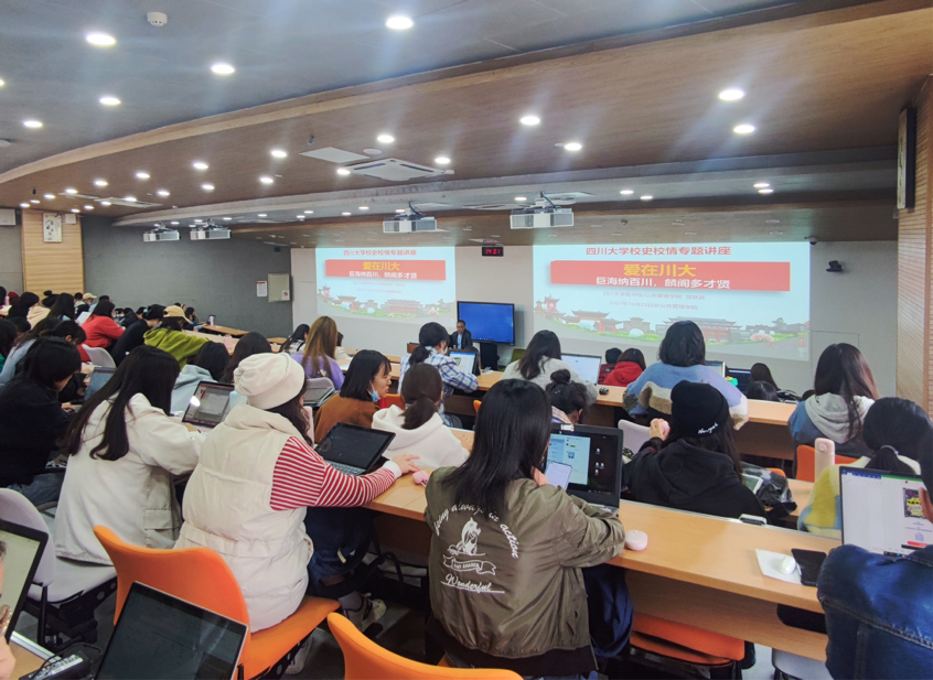 接着,党老师基于历史维度,先后从办学成就、学科特色、人才培养等方面,全方位、多角度地展示了四川大学自建校以来,不断提高教学质量,开展教学改革,培养优秀人才,建设双一流大学的曲折历程。此外,党老师还列举了朱德、巴金、杨尚昆、郭沫若等知名校友,激励同学们做“品格朴实,学风求实,知识扎实,为人诚实,做事踏实”的“五实之人”。