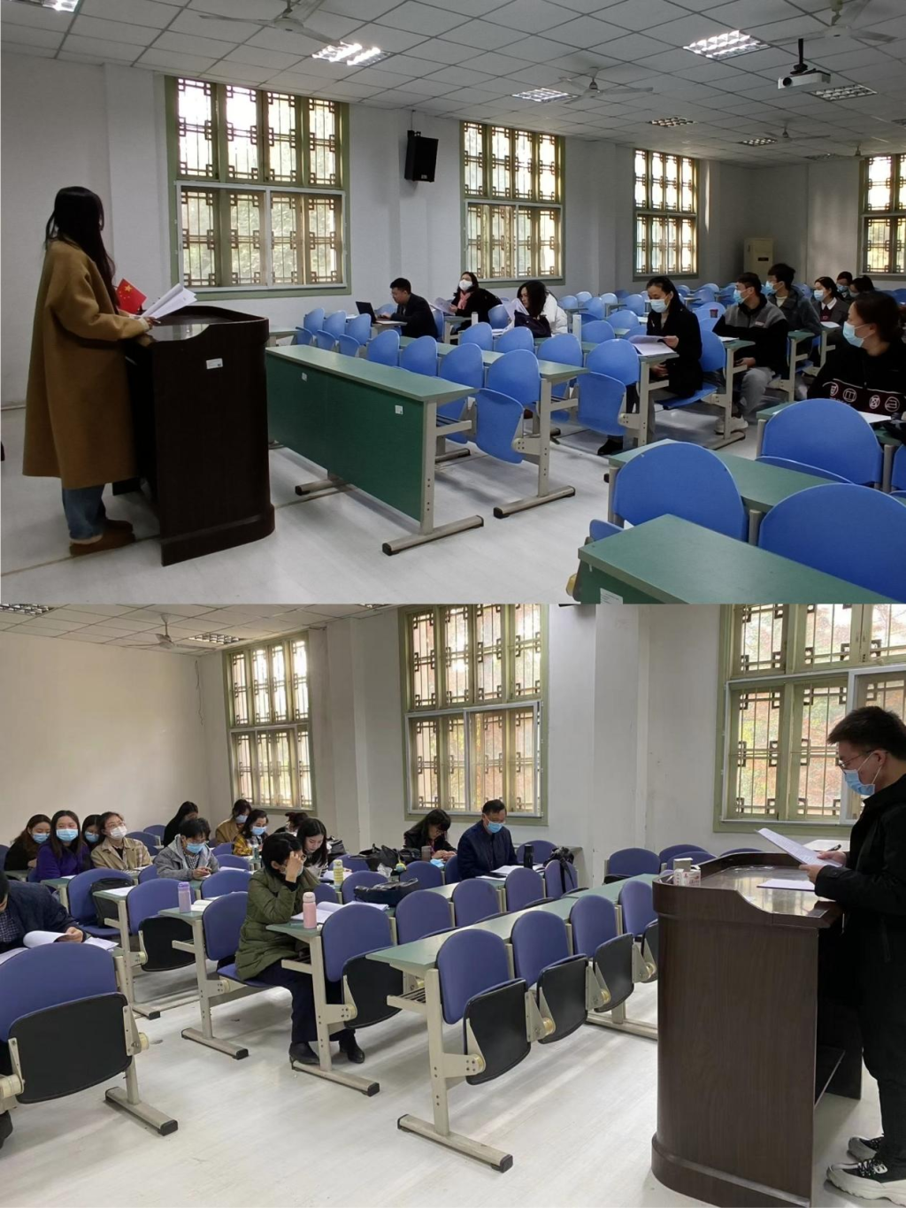 开题报告会分为学生陈述和老师点评两个环节。同学们依次汇报,对论文的选题原因、选题背景、选题意义、国内外研究现状、研究内容、研究方法与思路等方面内容展开陈述,接着,现场的评委老师对论文的选题、关键概念、理论基础、研究内容、研究范式等方面进行点评和指导。