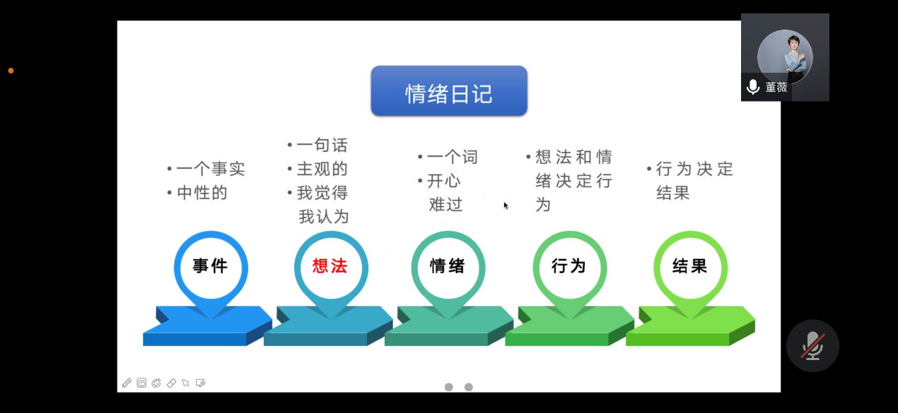 而后董薇老师为同学们分析了考研前各种负面情绪的产生过程,是从一个事件激发起对这一事件的认知,再在这种认知下产生身心感受,这种感受让人想对外输出能量,最后在这股能量支配下产生行动。由此出发,董薇老师介绍了费斯汀格事件重新整理法,通过重新拆解情绪产生过程,将客观事实转变成自我关怀,进一步止恶扬善。