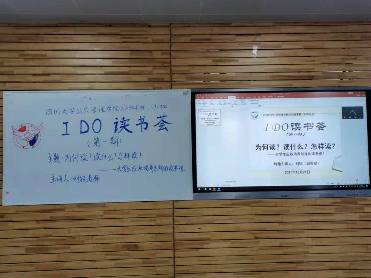 2021年12月21日14:30,公共管理学院2020级本科第一期“IDO读书荟”在江安校区基础教学楼D203教室成功举办。公共管理学院行政管理系刘锐副教授作为特邀嘉宾主讲了本次读书荟,读书荟由2020级本科辅导员苟欢老师主持,2020级本科学生各专业同学通过线下线上的方式参加了本次读书荟。