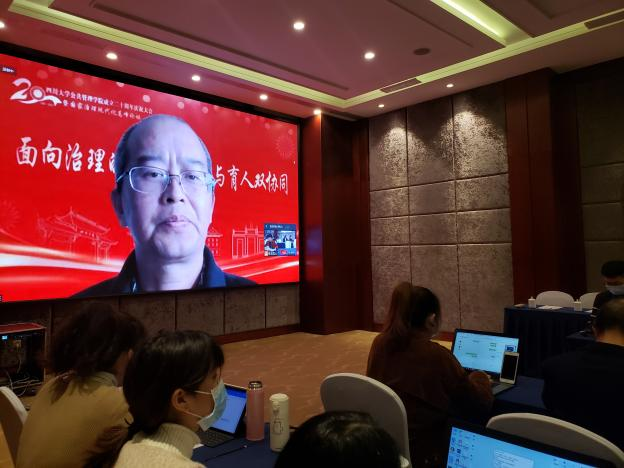 2021年12月25日下午,四川大学公共管理学院成立二十周年庆祝大会暨国家治理现代化高峰论坛的平行论坛之一“图情档论坛”成功举办。本次论坛以“面向治理的图情档学科与育人双协同”为主题,采取线上线下结合的形式,汇集学界知名专家与业界相关领导,共谋图情档学科生存之道,共论图情档事业发展契机。