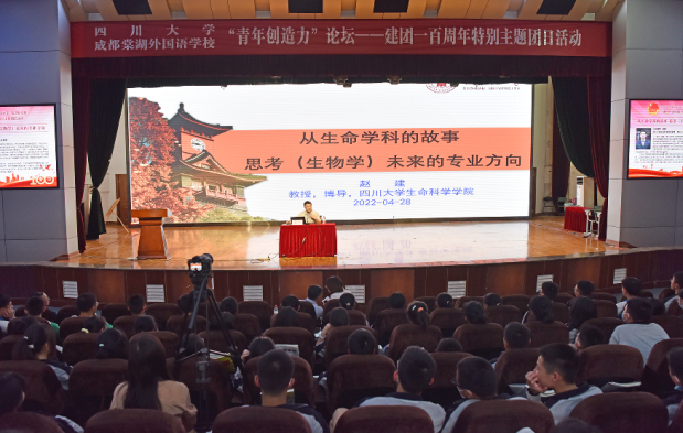 2022年4月28日,公共管理学院联合生命科学学院,历史文化学院(旅游学院),马克思主义学院邀请多位教授共同赶赴成都市棠湖外国语学校开展“青年创造力”论坛。棠湖外国语学校参会人员有棠外理事长黄波,高中校长杜宗平,校团委书记张莉及一千五百名高中学生。本次活动由生命科学学院赵建教授,历史文化学院黎海超教授,马克思主义学院郭绍均副教授,公共管理学院袁莉副教授形成四个分论坛同时进行。