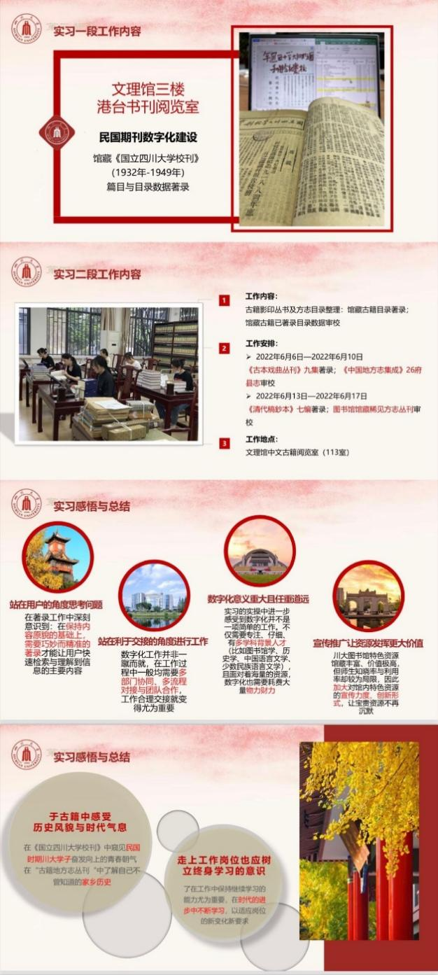 特色资源中心主任李咏梅老师表示同学们的学习能力以及适应能力都很强,对工作中遇到的问题如辨认繁体字等都可以很快解决。在古籍项目的参与过程中,同学们感受到了巴蜀文化的魅力,了解到了校刊背后的文化历史,善于从中进行总结,很好地体现出了图书馆“服务至上”的理念,为学校相关的科研工作打下了基础。