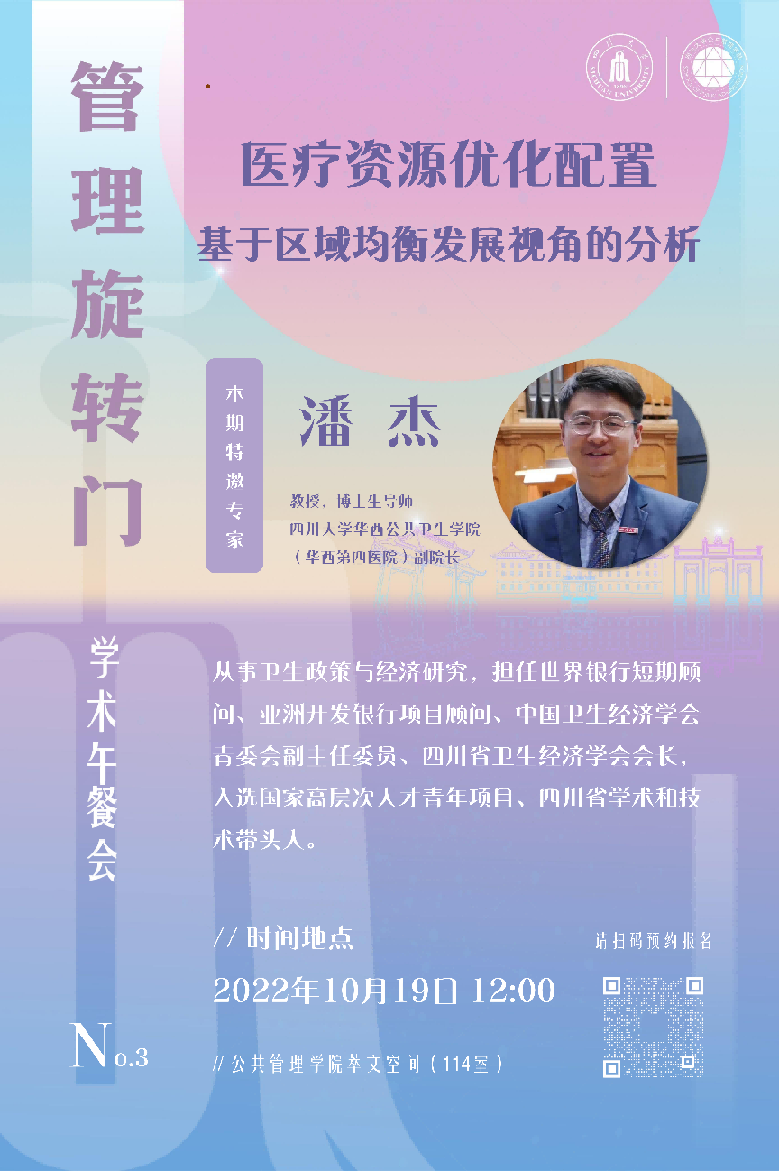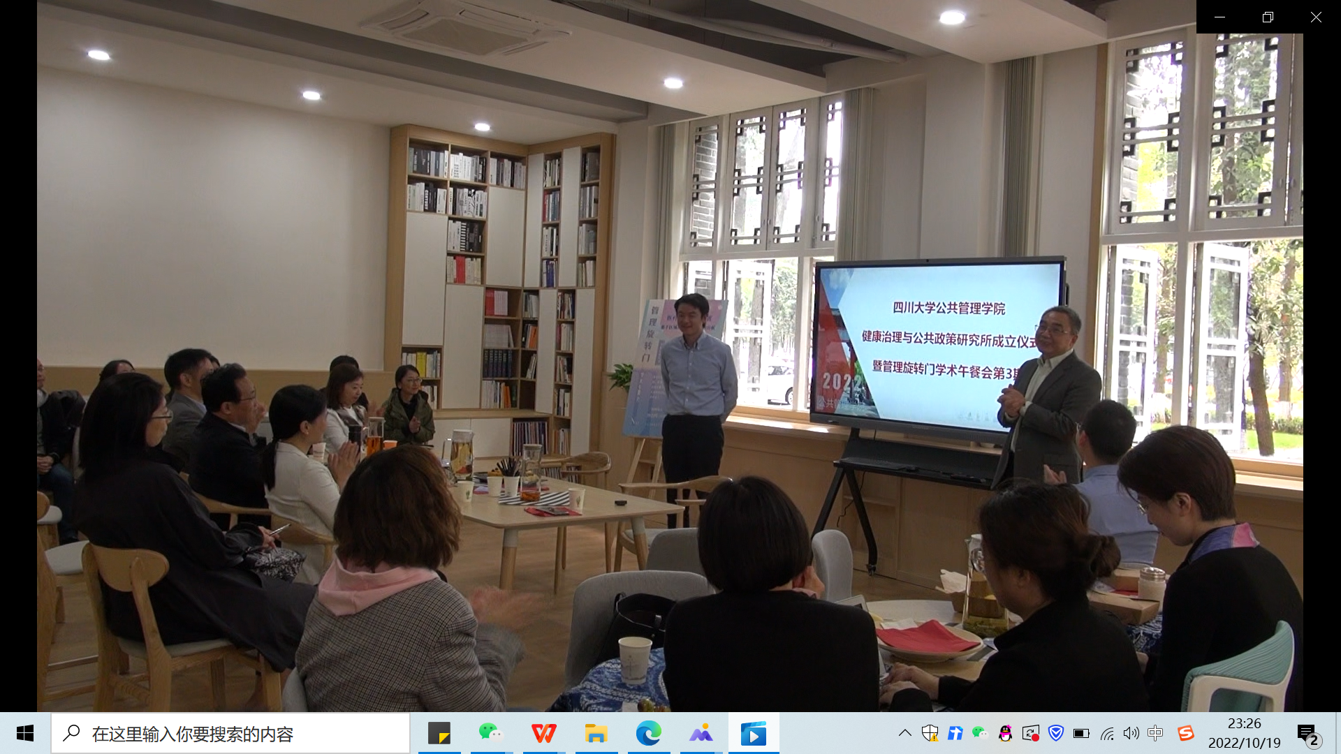2022年10月19日,四川大学公共管理学院健康治理与公共政策研究所成立仪式和第3期“管理旋转门”学术沙龙在学院共享空间(萃文空间)举行。本次活动特邀华西公共卫生学院(华西第四医院)副院长、博士生导师潘杰教授作为主讲嘉宾,学院各系老师积极参加了此次学术活动。