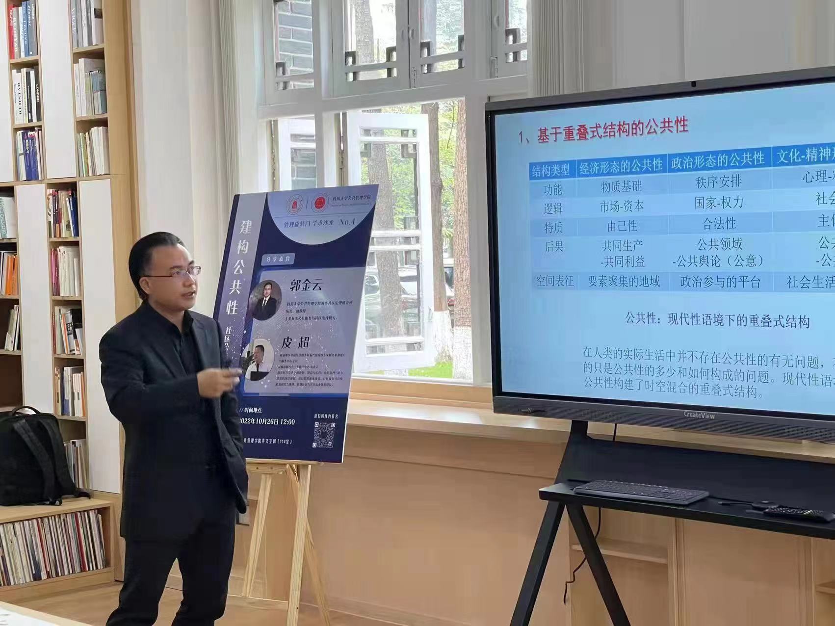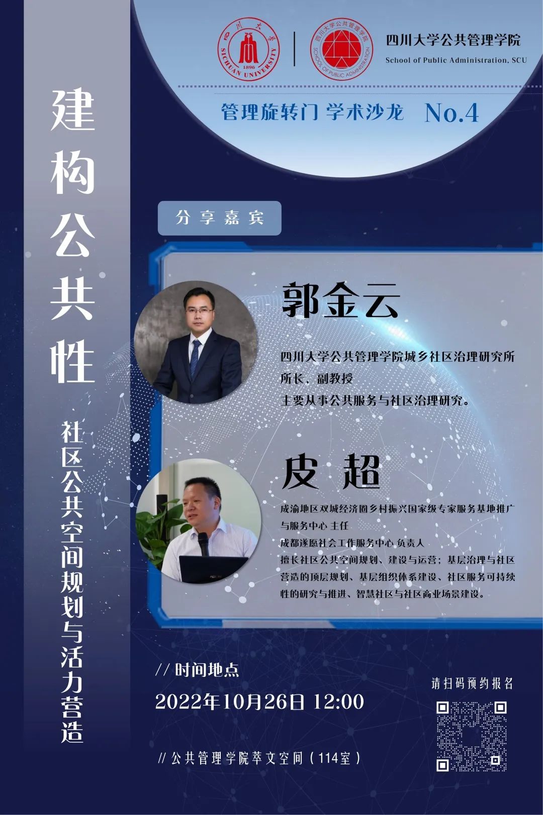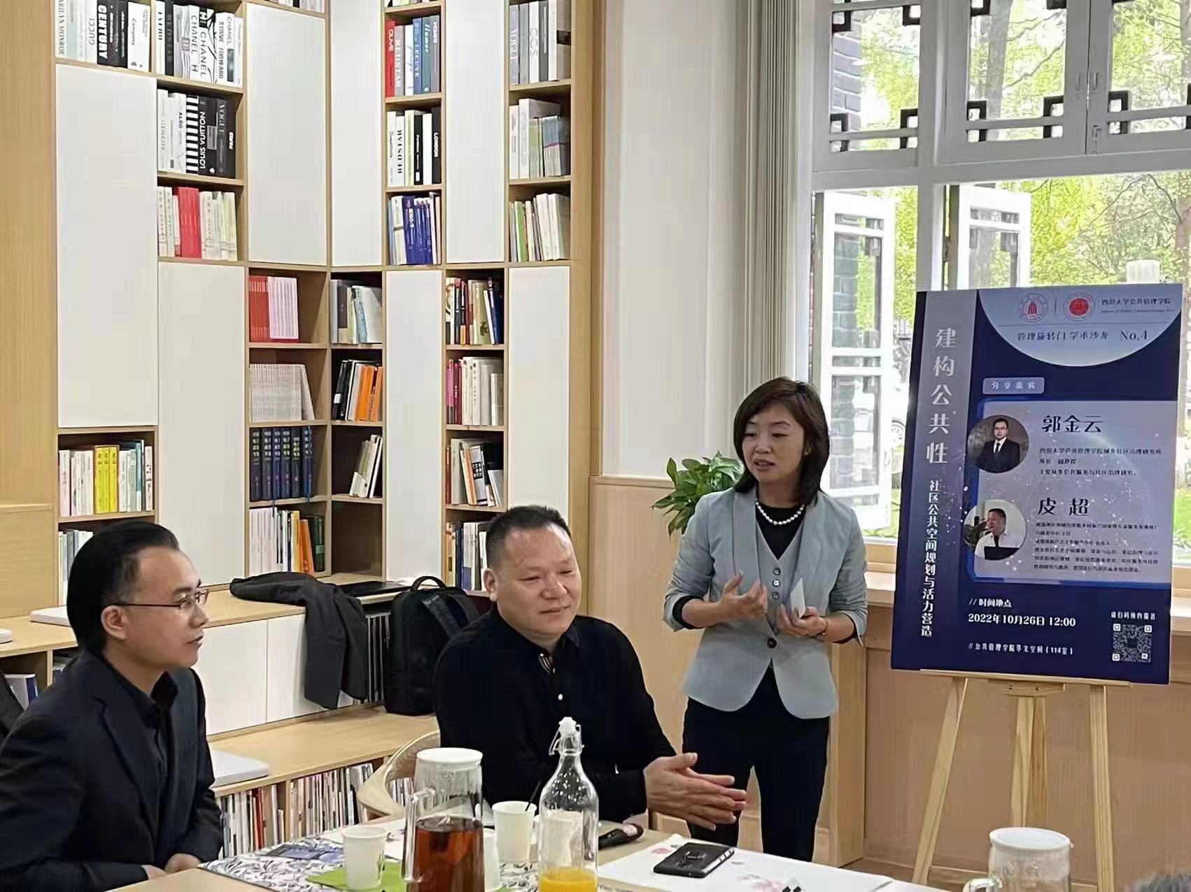 2022年10月26日,“管理旋转门”第四期学术沙龙在学院共享空间(萃文空间)举行。本次活动特邀成渝地区双城经济圈乡村振兴国家级专家服务基地推广与服务中心主任、成都遂愿社会工作服务中心负责人皮超,我院城乡社区治理研究所所长、行政管理系郭金云副教授共同作为分享嘉宾,开展题为“建构公共性:社区公共空间规划与活力营造”的主题交流。
