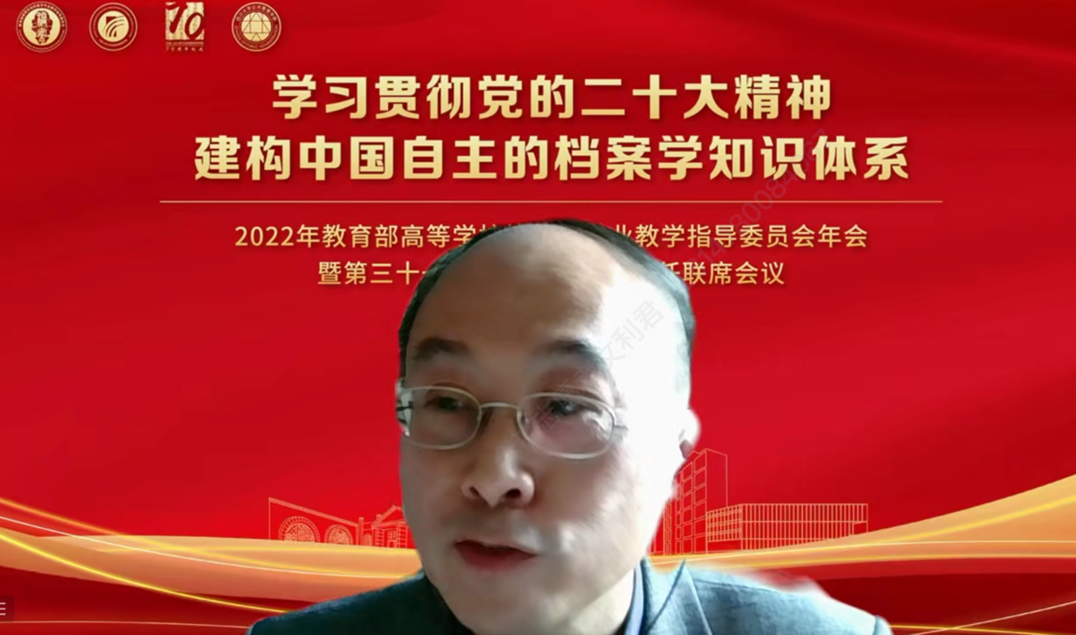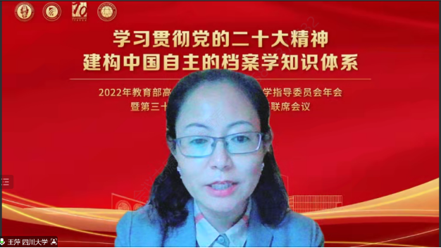 2022年11月12日,由教育部高等学校档案学专业教学指导委员会主办、四川大学公共管理学院与中国人民大学信息资源管理学院联合承办的2022年档案学教指委年会暨第31届档案学专业系主任联席会议如期在云端举行。本次会议是在党的二十大胜利召开后的档案学界的一次高层次会议。会议主题为“学习贯彻党的二十大精神,建构中国自主的档案学知识体系”。与会人员包括教育部高等教育司人文社科教育处张庆国处长、国家档案局人事司干部二处王琳处长、四川大学姚乐野副校长、档案学教指委主任委员、副主任委员、秘书长、委员及各高校档案学专业负责人。