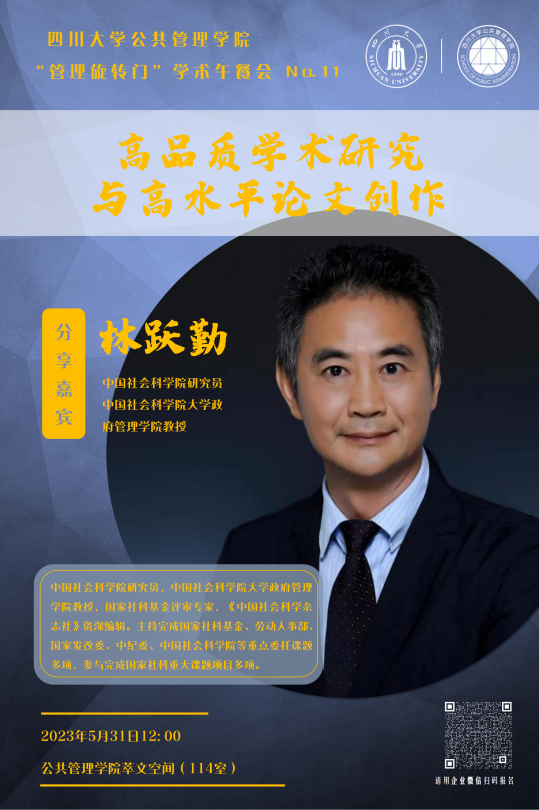5月31日,四川大学公共管理学院在学院萃文空间成功开展第十一期“管理旋转门”学术沙龙活动。本期学术沙龙特邀中国社会科学院研究员、中国社会科学院大学政府管理学院教授林跃勤先生作题为“高品质学术研究与高水平论文创作”报告。学院领导班子成员、各学科老师、硕博士研究生约50人参加了本次活动。
