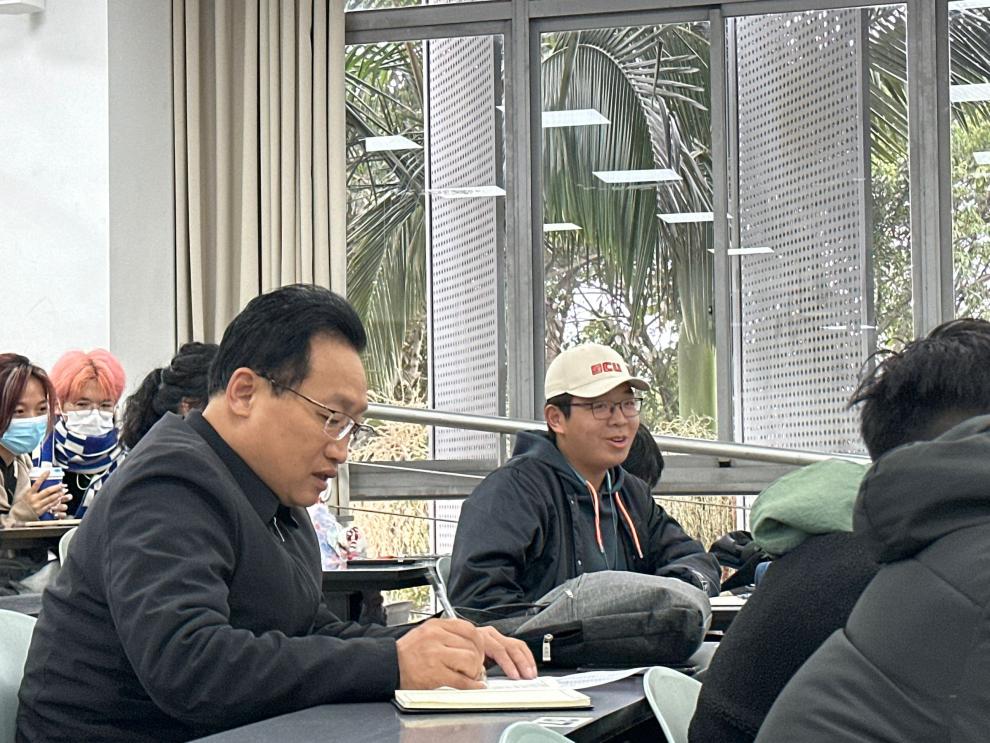 韩杰密切关心同学们的学习生活情况,向同学们表达真挚的问候,同学们也积极分享各自在学习与生活中的收获和困惑。韩杰认真倾听同学们的反馈,对同学们的发展规划提出了真诚建议。在学习方面,建议同学们把握学习节奏,合理规划课外实践活动;在生活方面,鼓励同学们积极参加体育锻炼,注重身心健康。