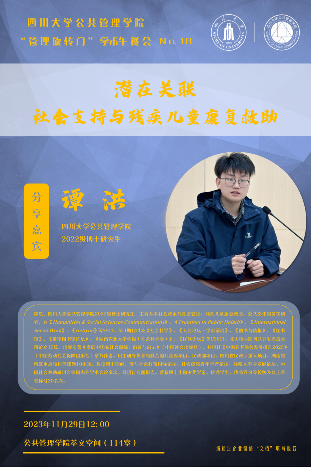 11月29日,公共管理学院在学院萃文空间成功开展第十八期“管理旋转门”学术沙龙活动。本期学术沙龙特邀本学院2022级博士研究生谭洪分享“潜在关联:社会支持与残疾儿童康复救助”,学院部分学科老师,博士及硕士研究生积极参加了此次交流。本期学术沙龙由劳动与社会保障系田益豪副研究员担任学术主持。