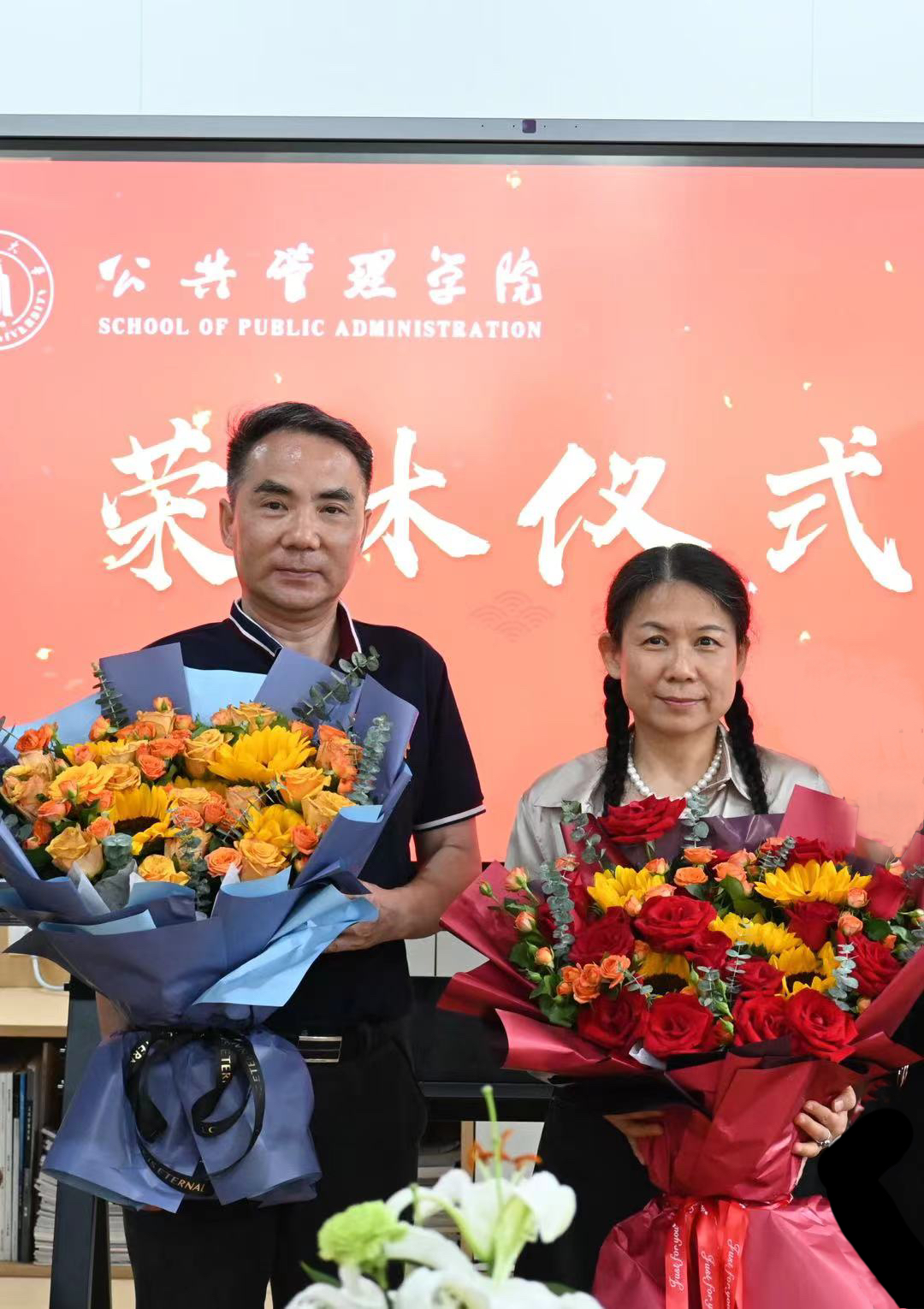 5月24日,公共管理学院刘艳、吴耀宏老师荣休仪式在望江校区萃文楼举行。学院班子成员,刘艳老师、吴耀宏老师,同事代表、离退休教师代表、院友代表、学生代表50余人参加了本次荣休仪式。荣休仪式由工会副主席刘玲主持。