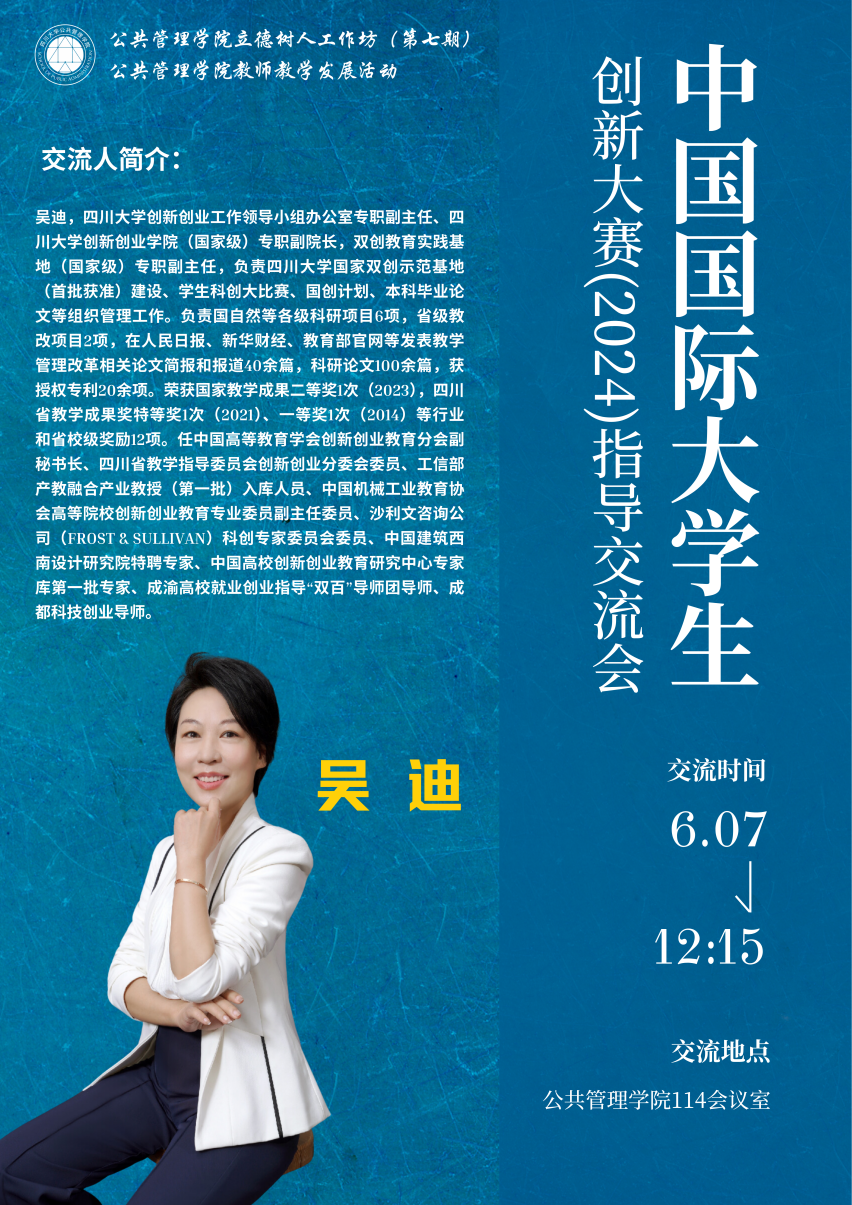 本次活动邀请四川大学教务处副处长、创新创业工作领导小组办公室专职副主任、创新创业学院(国家级)专职副院长、双创教育实践基地(国家级)专职副主任吴迪副教授进行指导交流,2021级社会工作专业张孙点滴同学进行参赛经验分享,公共管理学院申报了创赛及对比赛感兴趣的部分师生参加了此次活动。