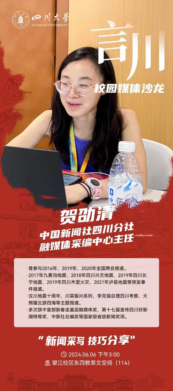 为推进学校基层单位宣传工作质量提升,校党委宣传部组织开展“言川”校园媒体沙龙系列活动。近日,由校党委宣传部主办、公共管理学院承办的第1期沙龙活动在望江校区萃文楼顺利开展。中国新闻社四川分社融媒体采编中心主任贺劭清应邀作“新闻采写技巧”专题分享。校党委宣传部副部长陈薇,商学院党委副书记李小平,海外教育学院等单位宣传工作人员,公共管理学院副院长王慧敏,公共管理学院各党支部宣传委员、教职工代表、学生代表等40余人参加了此次活动。活动由陈薇主持。