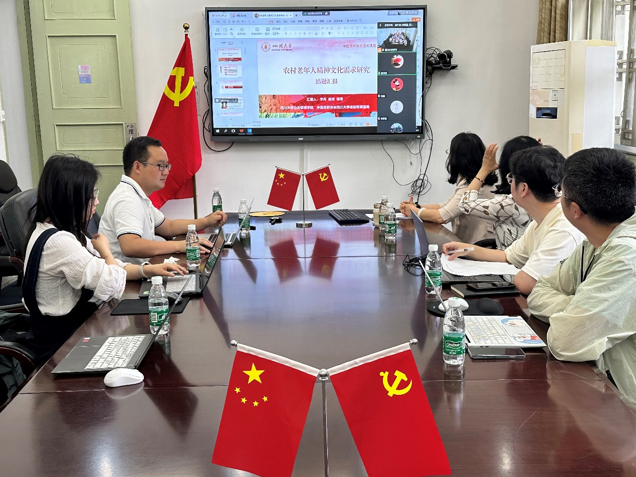 近日,中国老龄协会委托四川大学公共管理学院老龄科研基地承担的课题“农村老年人精神文化需求研究”结题会议召开。会议由中国老龄协会政策研究部副主任骆开定主持。中国老龄协会政策研究处副处长董彭滔,调研员甄蓉以及干部刘淼、李芳云,我院党委副书记罗亚玲教授以及李丹教授、杨帆副教授和部分硕博士研究生参加了此次会议。会议邀请了中国人民大学人口与健康学院副教授谢立黎、中国老龄科研中心老龄战略与政策研究所副所长方彧、中国老龄科研中心老龄宜居环境研究所副研究员陈泰昌等进行专家评审论证。