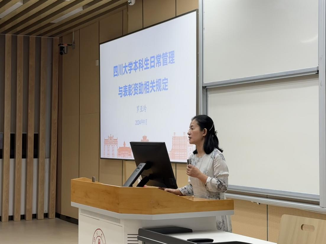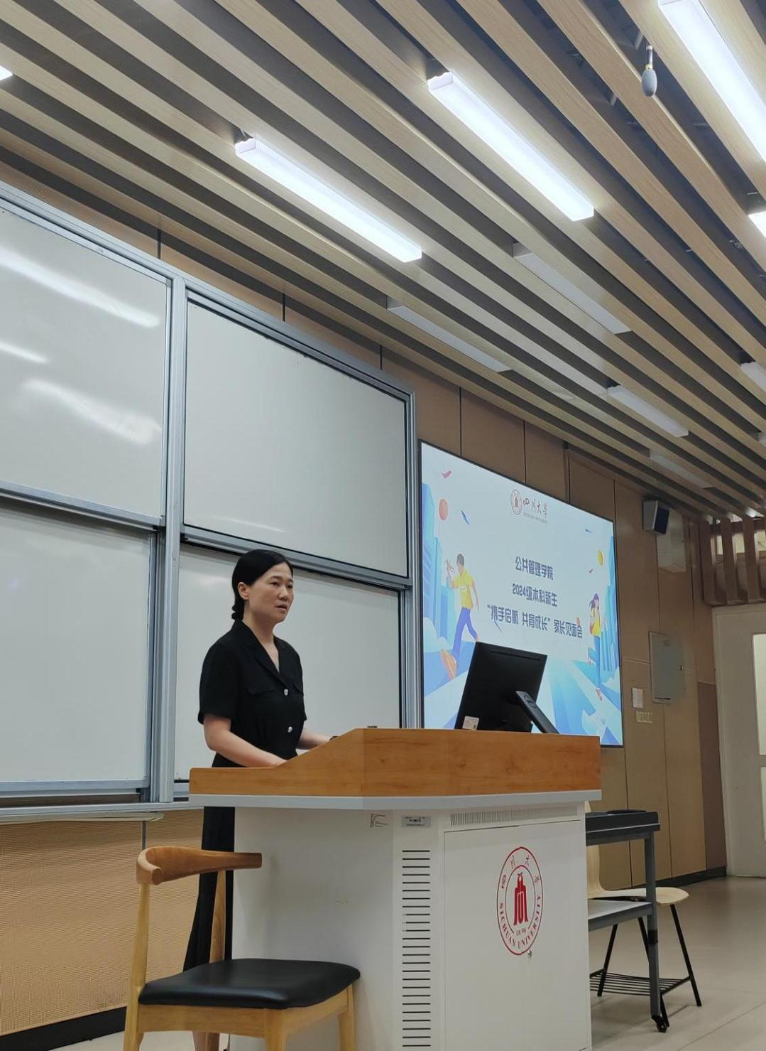 为加强家校沟通交流,促进双方有效合作,构建良好的协同育人机制,9月6日晚7点,四川大学公共管理学院在江安校区综合楼召开2024级本科新生家长见面会。公共管理学院党委书记韩杰、党委副书记罗亚玲、副院长袁莉出席了此次见面会,心理健康教育中心王瑾一受邀作主题分享。见面会由公共管理学院2024级本科辅导员陈萱源主持,200余位新生家长参与了见面会。