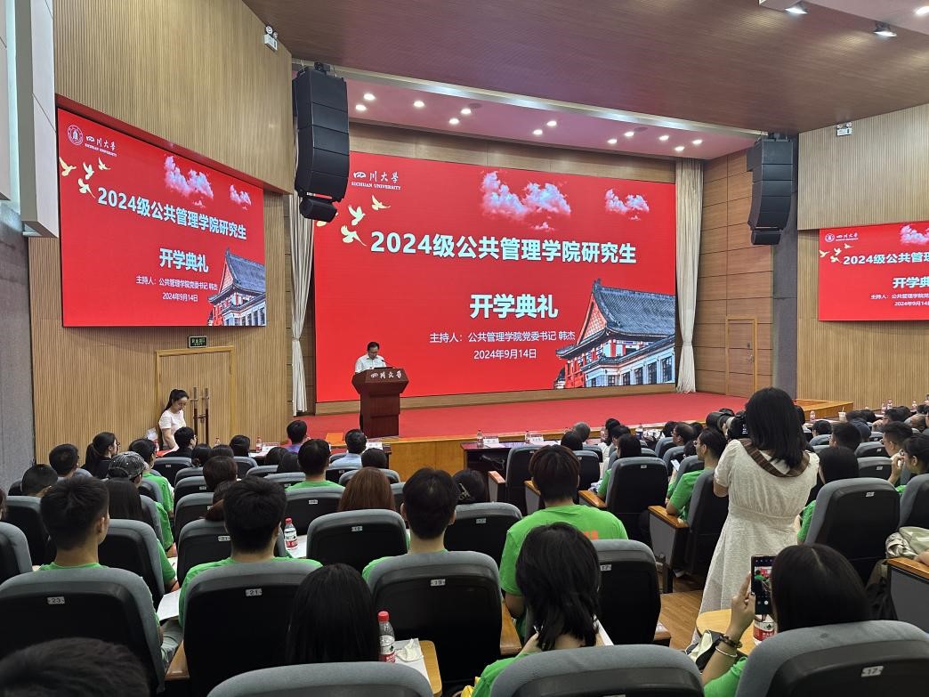 9月14日下午,四川大学公共管理学院2024级研究生开学典礼暨“开学第一课”在望江校区西区五教演播厅隆重举行。公共管理学院教授委员会主任姜晓萍、党委书记韩杰、院长夏志强、党委副书记罗亚玲、副院长王慧敏,师生代表及2024级全体新生参加典礼,开学典礼由党委书记韩杰主持。