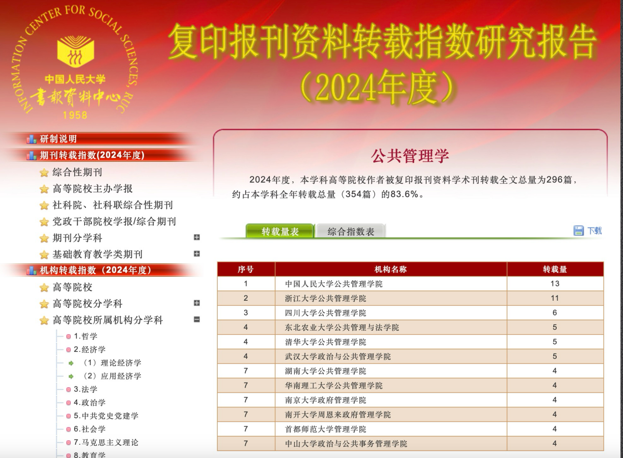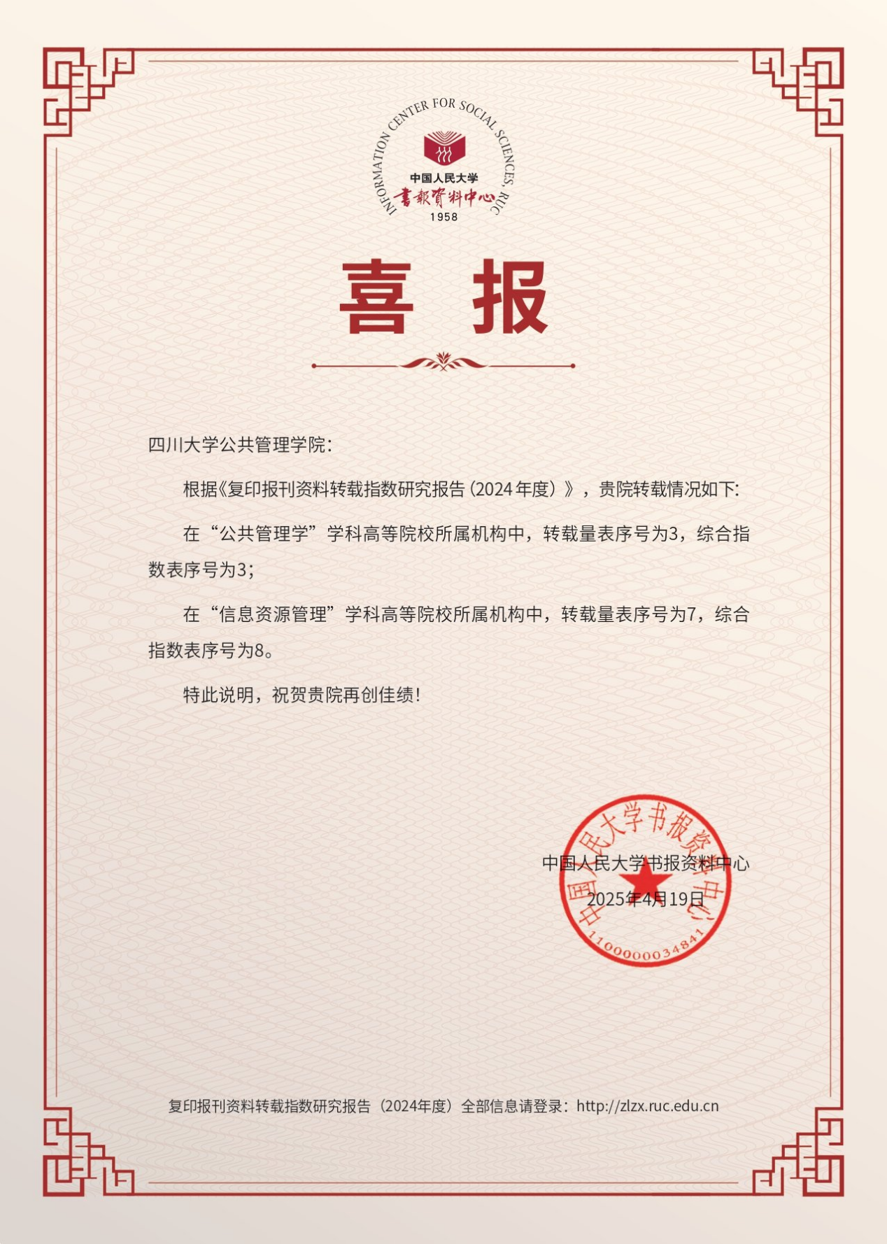 近日,中国人民大学书报资料中心发布了《复印报刊资料转载指数研究报告(2024年度)》。在“公共管理学”学科高校所属机构排名中,四川大学公共管理学院转载量位列全国第3,综合指数位列第3;在“信息资源管理”学科高校所属机构排名中,四川大学公共管理学院转载量位列全国第7,综合指数位列第8。本次入选展现了学院在公共管理学、信息资源管理两大领域的强劲学术影响力与持续创新能力。