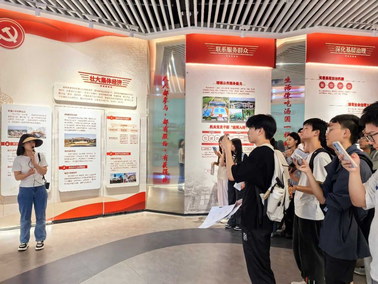 师生统一乘校车抵达战旗村游客中心,在工作人员带领下参观各展厅:“战旗初心馆”回溯总书记视察场景与党建足迹,“精彩战旗馆”探究特色产业奥秘,“乡村十八坊”领悟改革成果。