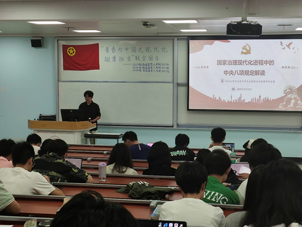 为深入学习贯彻中央八项规定精神,搭建理论学习与实践认知的贯通平台,2025年5月23日,四川大学百川青年学生宣讲团公共管理学院分团走进四川大学华西临床医学院本科团支部,开展“国家治理现代化进程中的中央八项规定解读”主题宣讲活动,宣讲团成员刘伟同志担任主讲。