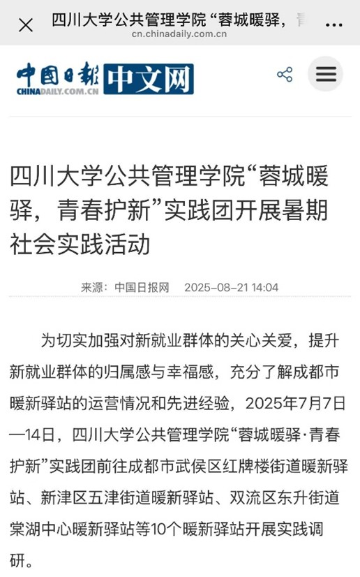 为深入学习贯彻习近平新时代中国特色社会主义思想,落实党的二十大精神、二十届三中全会精神和中央城市工作会议精神,深刻领会习近平总书记关于新就业群体的重要讲话重要指示精神,切实加强对新就业群体的关心关爱,提升新就业群体的归属感与幸福感,充分了解成都市暖新驿站的运营情况和先进经验,2025年7月7日—14日,四川大学公共管理学院“蓉城暖驿·青春护新”实践团前往成都市武侯区红牌楼街道暖新驿站、新津区五津街道暖新驿站、双流区东升街道棠湖中心暖新驿站等10个暖新驿站开展实践调研。