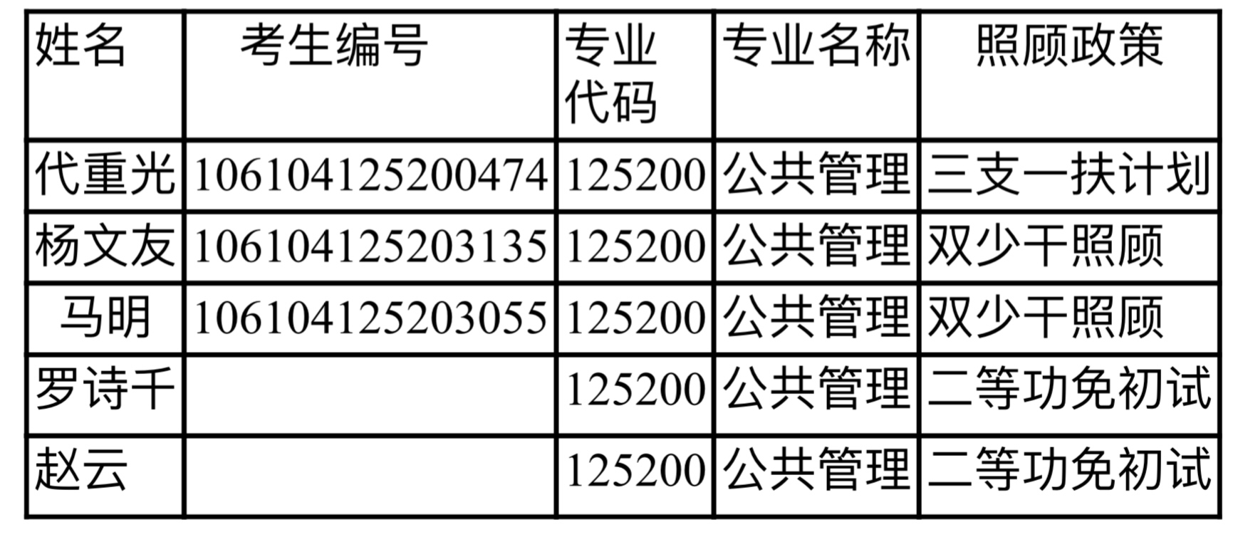 按教育部相关政策及提供的名单,现将报考我院符合享受照顾政策的考生名单公示如如下: