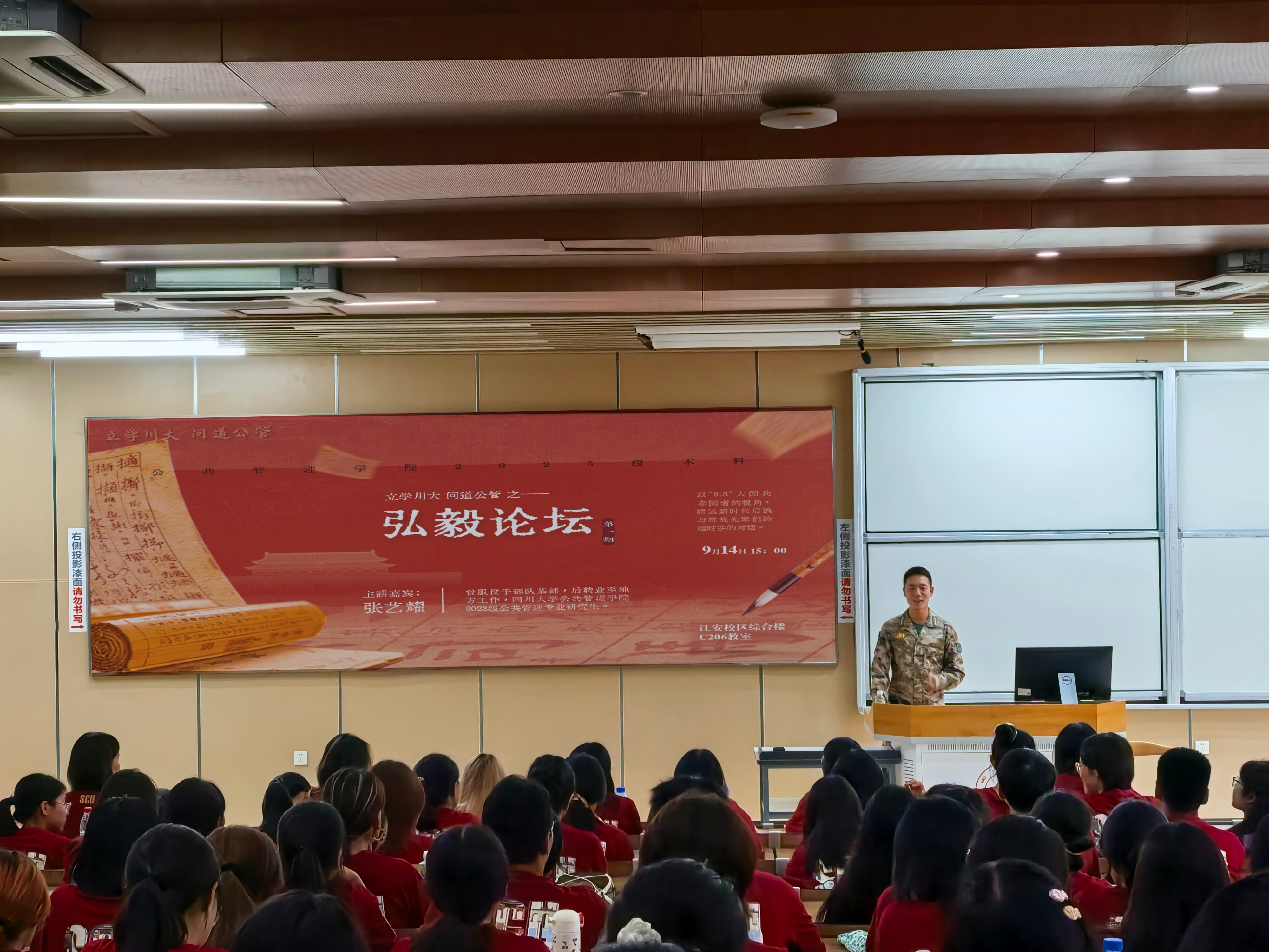为淬炼坚毅品格、激发时代使命,9月14日下午,公共管理学院本科低年级党支部在江安校区综合楼C座206教室举办了“弘毅论坛”第1期——“九三阅兵”参阅学长事迹报告会。报告会由学院党委委员、本科低年级党支部书记、2025级本科生辅导员青杨媚主持,2025级全体本科新生参会学习。