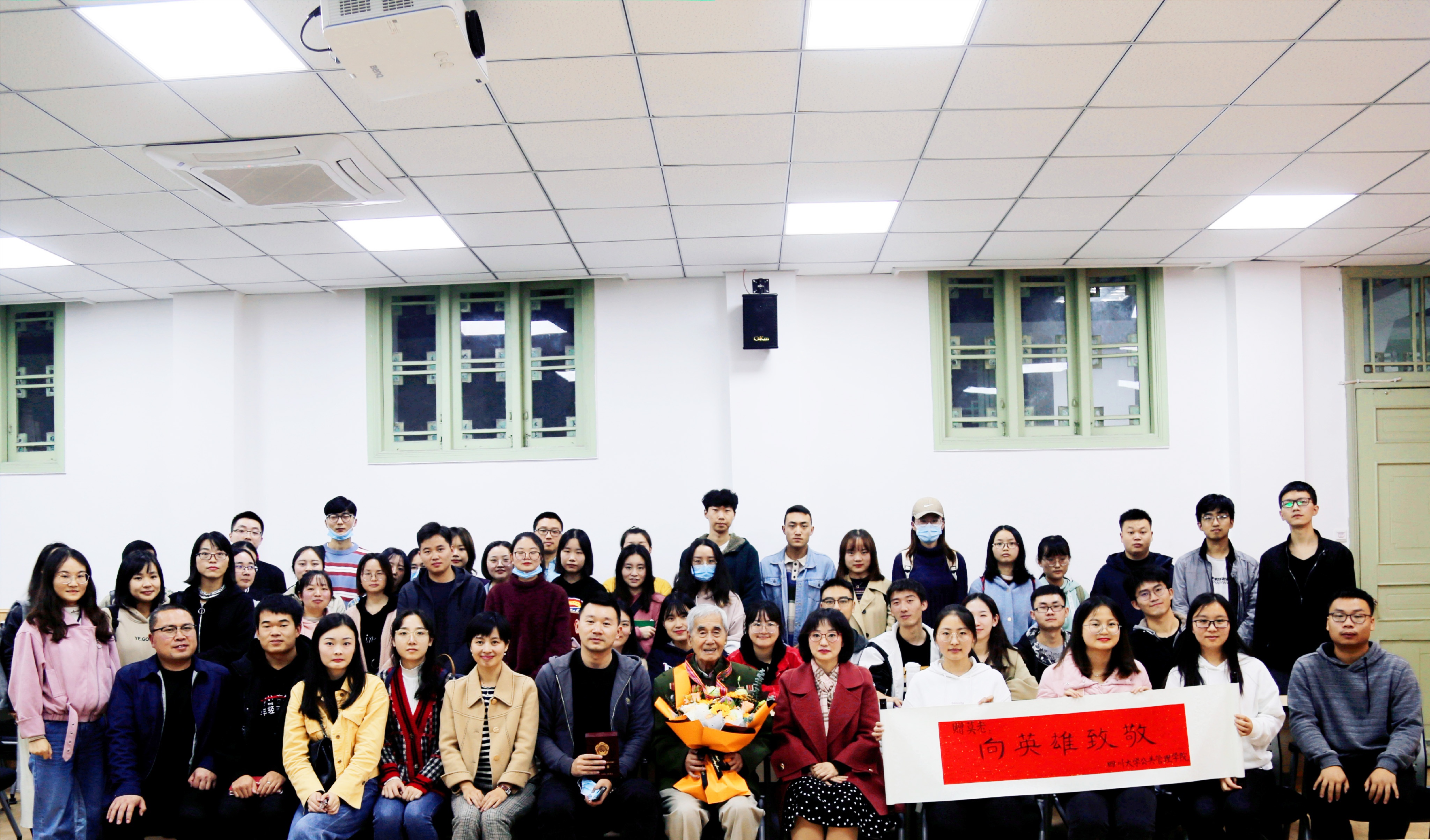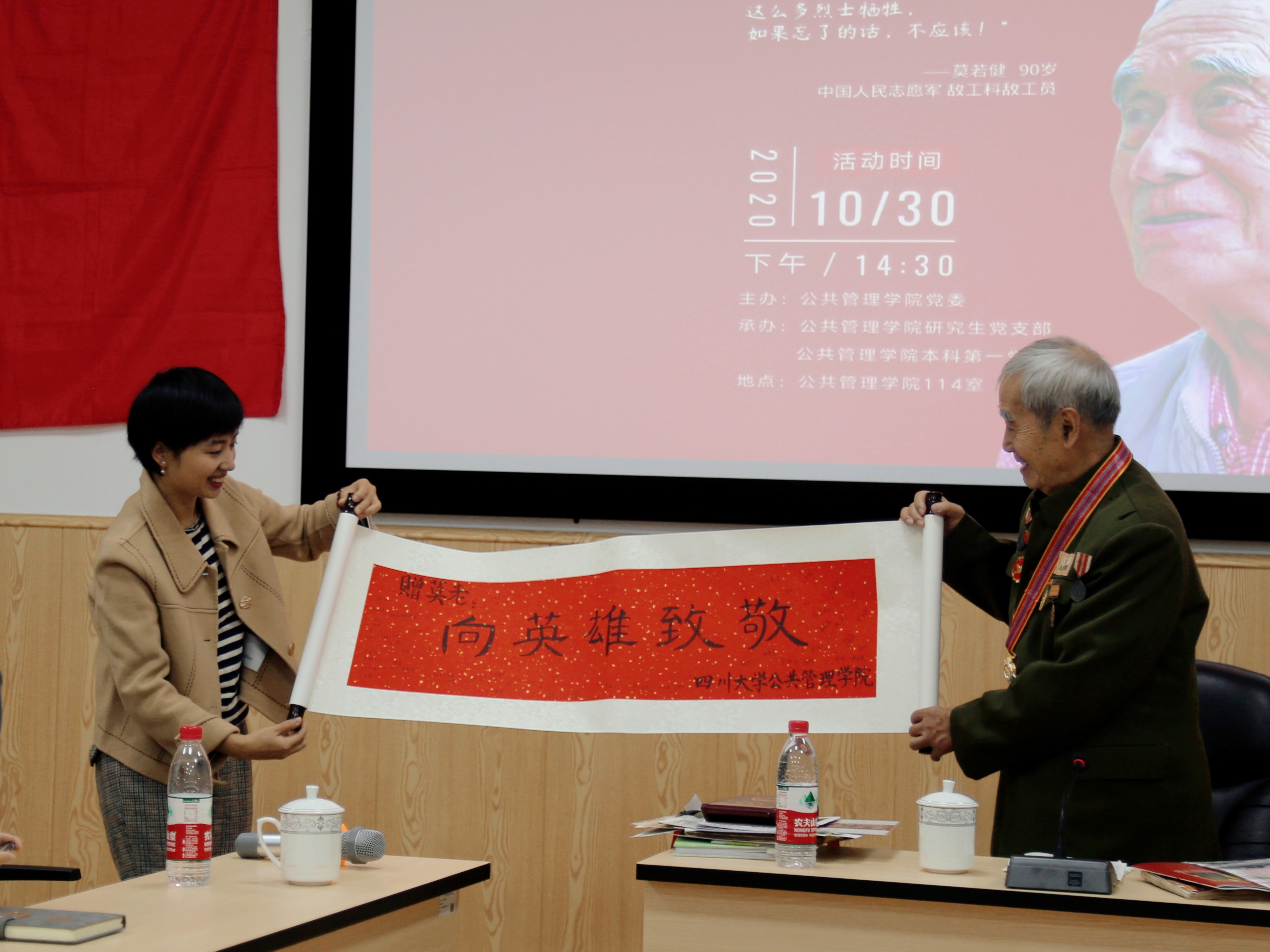 活动结束,2020级研究生辅导员、本科第一党支部书记陈萱源向莫老赠送了纪念品:由公管研究生书写的“向英雄致敬”卷轴,卷轴上有所有到场同学的签名和祝福。