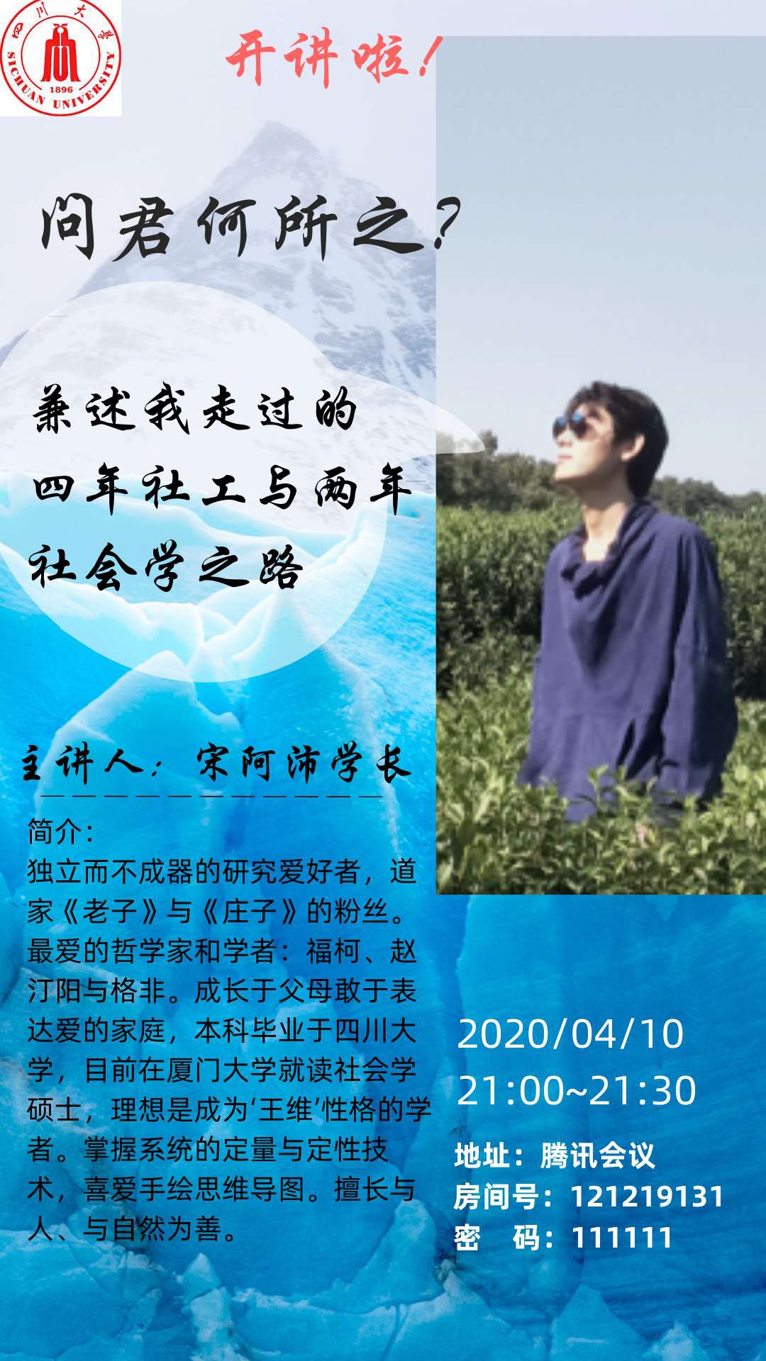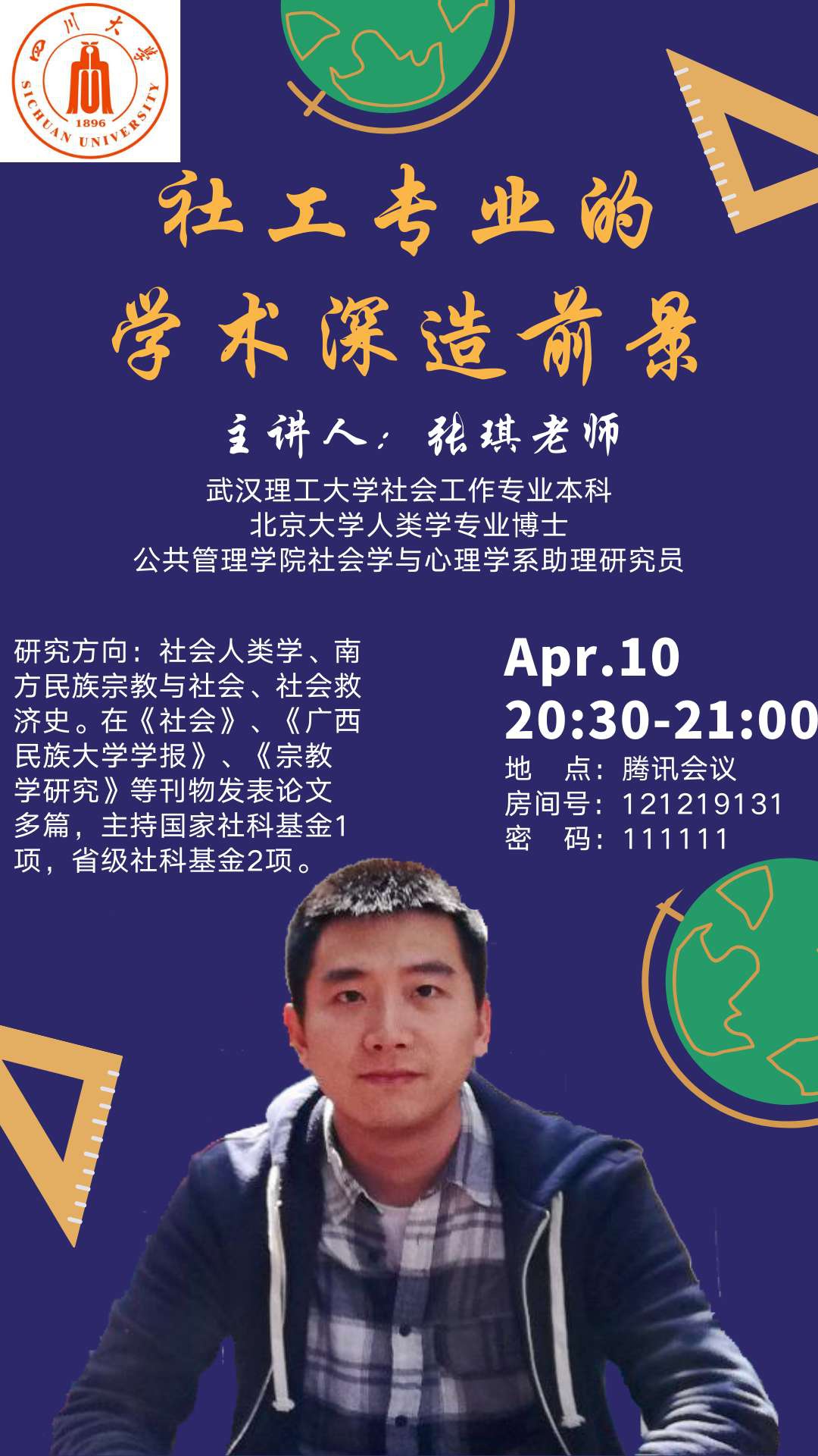 李博超同学率先开讲。他向同学们讲述了为何选择社工专业、他对社工专业的理解、毕业后选择公益事业的心路历程。不仅使同学们直观地了解本专业的就业前景,也感受到李同学长期致力于解决同一个社会问题的情怀。同学们纷纷留言致谢和互动,感谢李同学从求职就业层面对社会工作专业前景的讲解。随后,张琪老师从升学深造层面,向同学们展示了他对社会工作专业深造前景的深刻见解。他从以就业为导向和以学术为导向两个方面,探讨了社会工作专业继续深造的专业优势。为使大家更明晰,他又通过自己以及朋友的亲身经历,向同学们指明社会工作专业学生未来升学深造的大方向。言毕,同学们主动表示感谢,交流会氛围热烈,进入一个小高潮。最后是宋阿沛同学分享,他向川大社会学与心理学系的老师们表示感谢,他认为川大社会工作专业为他的升学和研究打下坚实的基础,他给同学们分享了社会工作专业在分析问题和解决问题的优势,也谈到了自己本科期间的学习经验和对未来的规划,鼓励同学们将个人前途和专业学习结合起来思考,这些讲述引发了同学们的深思。