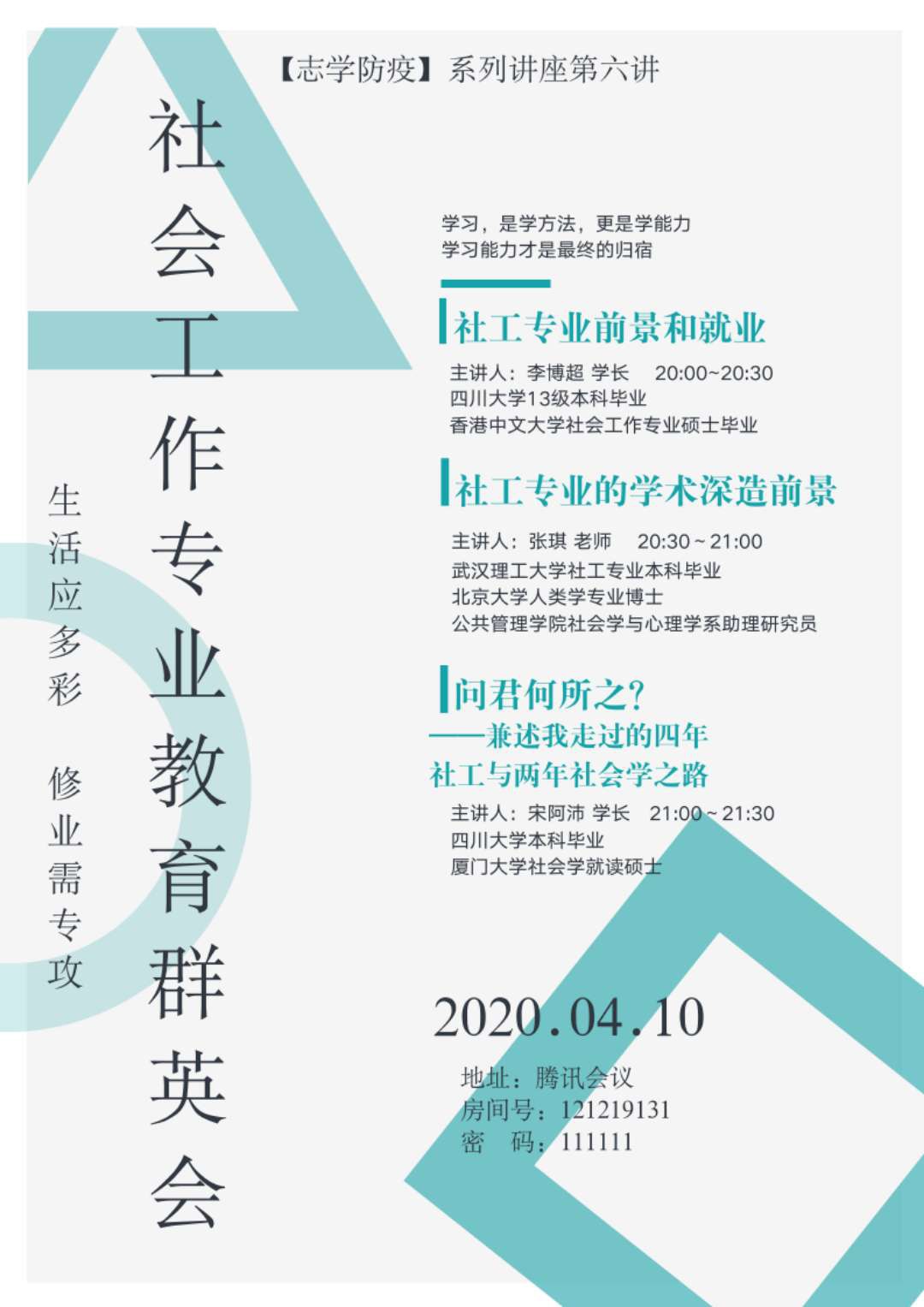 2020年4月10日晚8:00,社会学与心理学系张琪老师与两位社会工作专业培养的优秀毕业生李博超、宋阿沛线上为大一、大三的同学进行了一场别开生面的交流会,为学弟学妹们拨开专业迷雾。
