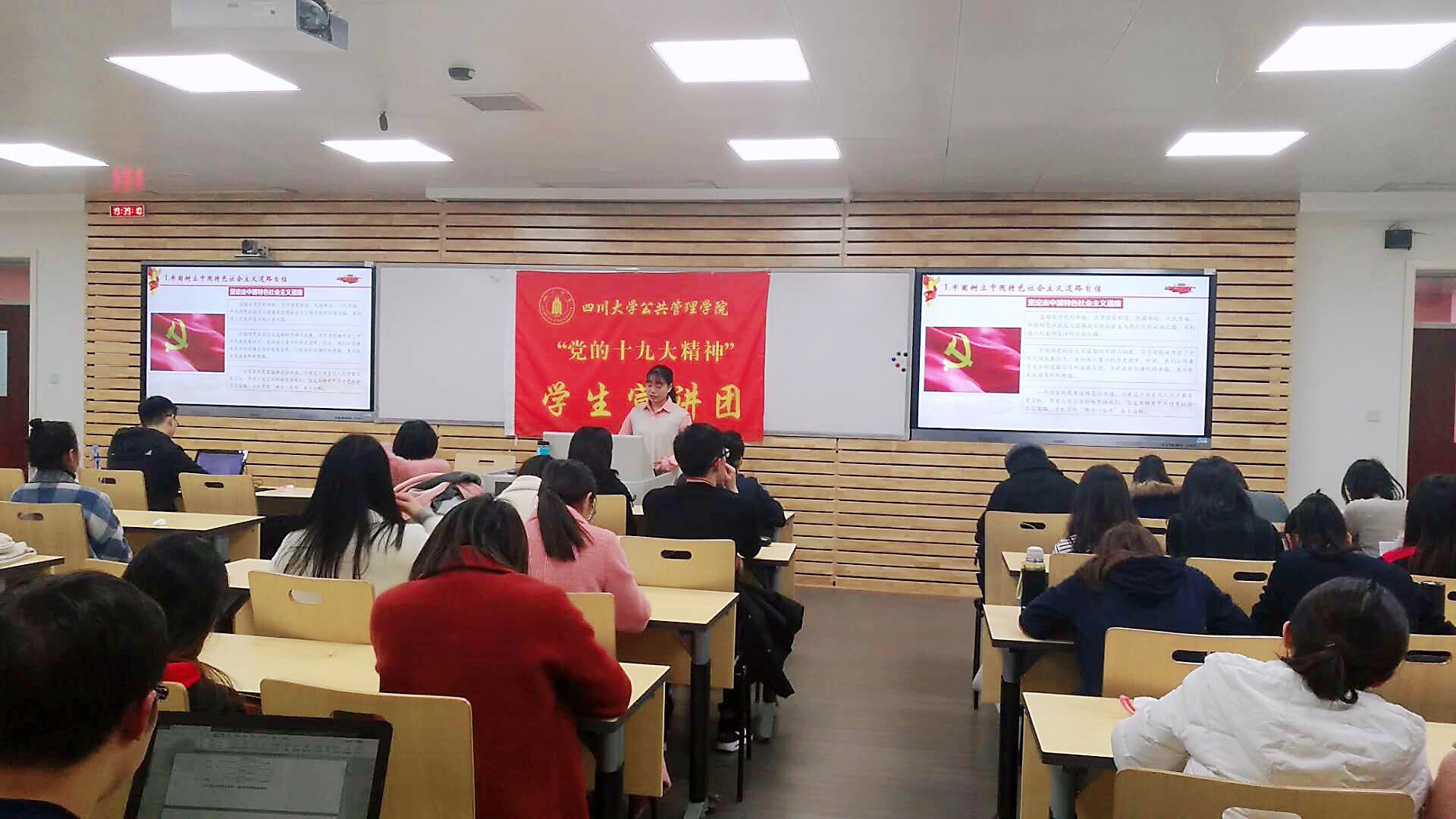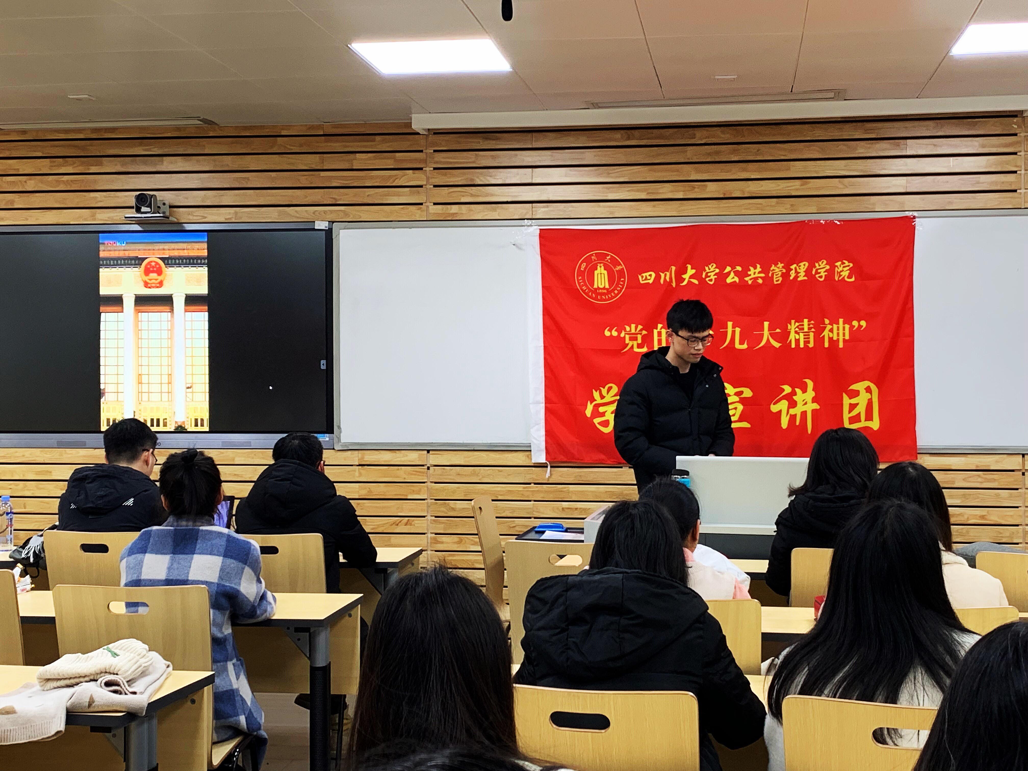为持续推动学习宣传贯彻党的十九大精神热潮,鼓舞同学们深刻领会报告的丰富内涵,把思想和行动统一到党的十九大精神上来,12月12日,公共管理学院2017级研究生党支部、学院“党的十九大精神”学生宣讲团在望江校区基础教学楼A座408教室联合法学院举办了“弘扬爱国奋斗精神,做新时代青年楷模”的主题宣讲会。2017级研究生第二、第四支部全体党员、法学院部分研究生党员参加了此次活动。2017级研究生第四支部书记青杨媚老师出席活动并讲话。