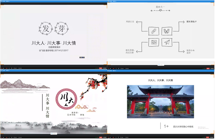 5月6日晚,一场题为“川大人·川大事·川大情”的线上主题演讲活动在《四川大学校史文化》课程“爱我川大”群课堂进行。为进一步加强疫情期间同学们线上学习的交流和互动,四川大学图书馆馆长、公共管理学院教授党跃武老师决定于该课程正式行课的第十一周开展此次主题演讲。选修本课程的同学们积极踊跃地参加了本次活动并做好了充足的准备工作。本次活动共有18位来自不同学院的同学进行了线上分享。