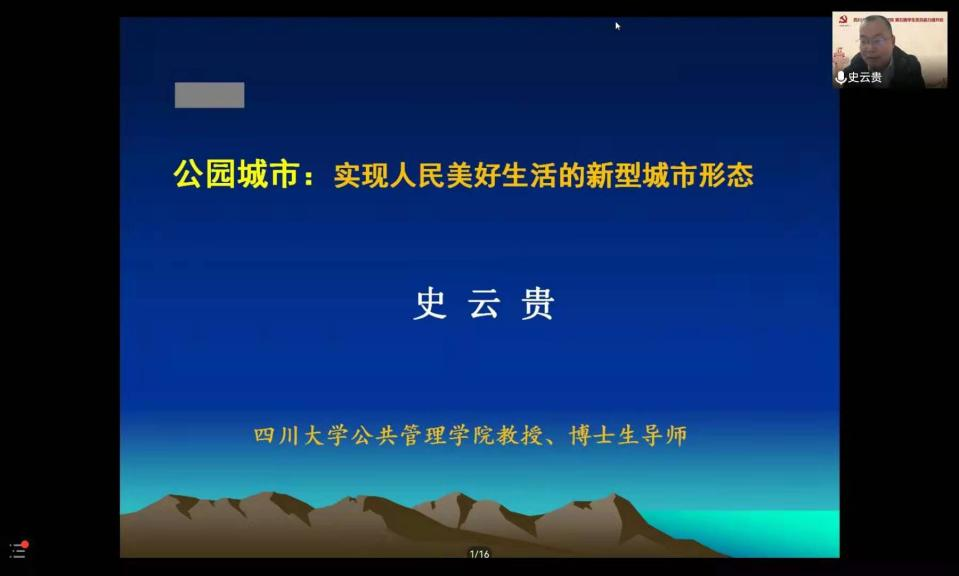 11月14日上午9:30,我院院长史云贵教授为大家带来题为:“公园城市:实现人民美好生活的新型城市形态”的讲座,讲座由刘晓燕老师主持。