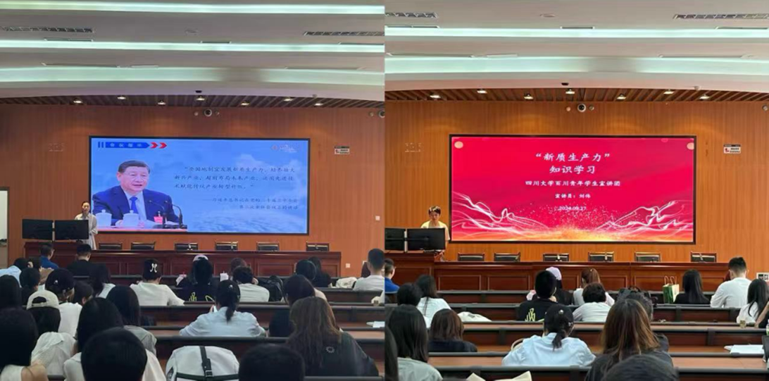 四川大学百川青年学生宣讲团、四川大学马克思主义学院博士生宣讲团宣讲员、马克思主义学院硕士研究生第二党支部金菲菲同志和四川大学百川青年学生宣讲团公共管理学院分团成员刘伟同志分别围绕“低空经济”和“新质生产力”进行主题宣讲。