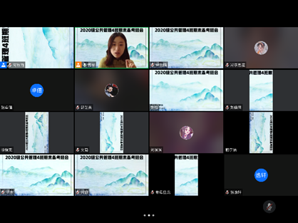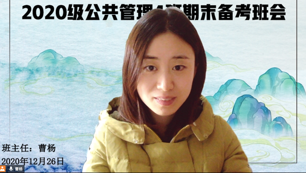 2020年12月26日上午,在班主任曹杨老师组织下,2020级公共管理4班召开了期末备考班会。因疫情和期末复习时间紧张的原因,此次班会采用线上方式进行,以期末备考为主题,围绕大学学习与生活两方面展开讨论。