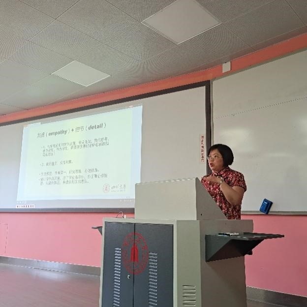 从学习贯彻习近平总书记全国教育大会重要讲话精神引入,兰利琼教授强调了“教育回归本位,教师作为领路人”的重要性。她解读了《四川大学班主任工作指导意见(试行)》,并从具备较高的专业水平、高度的责任感、与社会实践相结合、发挥老师的人格魅力、引导学生的全面健康成长等方面重点讲述了班主任工作的职责。她结合心理学相关知识,通过真实、鲜活的案例,阐述了班主任全方位引导学生成长人才、促进教育事业高水平发展的重要作用。