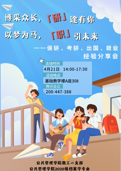 在考研经验分享环节,支部特别邀请了2019级档案学专业已成功上岸的钟瑞玲、孟焕和邓婧宜等同学分享了考研的备考方法和策略、时间规划等经验教训;在保研经验分享环节,黄思诗、田欣分享了她们的保研经历和心得,从准备材料、面试技巧等方面,为大家梳理保研脉络,减少“走弯路”的过程;在出国深造经验分享环节,刘之敏从自身的申请体会出发,介绍了出国深造的优缺点、申请经历、个人陈述以及资料准备技巧、雅思托福准备策略等;在考公经验分享环节,秦昕然为同学们分享了选调生和公务员考试的相关经验。