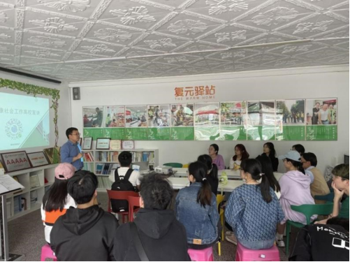 为促进理论学习和实践活动的紧密结合、深化学生对于课堂知识的理解和社会工作实务的认识,2023年4月12日下午,我院《家庭社会工作》课程共计18名同学在社会学与心理学系副教授崔珂老师的带领下走进成都市金牛区驷马桥街道社区康复服务站开展了实践参访。活动伊始,成都市利川社会工作服务中心社工代琼瑶先为同学们介绍了机构的成立背景与服务领域,询问同学们对精神健康以及精神康复者的认识。接着社工从“生活为本”的康复模式出发,介绍复元驿站具体开展的服务内容,引导同学们思考社区康复“是什么”、“做什么”等问题。