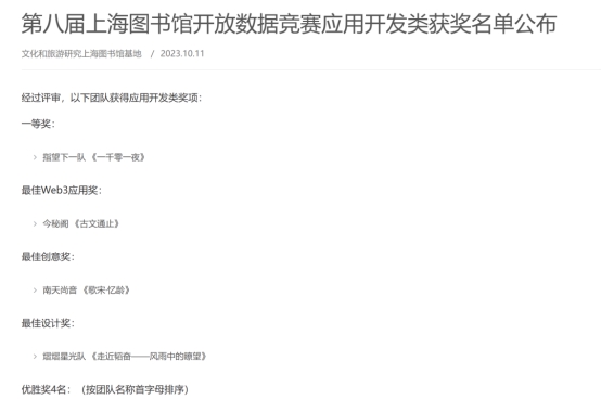 10月8日,第八届上海图书馆开放数据竞赛应用开发类决赛答辩于上海图书馆举行。此次比赛由上海市经济和信息化委员会、上海市文化和旅游局指导,由上海图书馆(上海科学技术情报研究所)、国际科学技术信息理事会(ICSTI)、上海市中心图书馆主办,与CADAL项目管理中心、中国历代人物传记资料库项目(CBDB)、复旦大学图书馆等多家单位进行合作。本届大赛以“链汇古今,AI赋人文”为主题,面向全球征集优秀移动应用原型、创意及算法。上海图书馆开放数据竞赛自2016年起已成功举办7届,被列入公共管理学院信息资源管理专业竞赛名单。大赛共吸引来自28个省市、国内外的一百多支队伍参赛,参赛选手涵盖了高校学生、企业团队、政府人员。本届大赛共设有应用开发类赛道、创意论文类赛道和算法类赛道,其中应用开发类赛道设一等奖1名、最佳Web3应用奖1名、最佳创意奖1名、最佳设计奖1名和优胜奖4名。