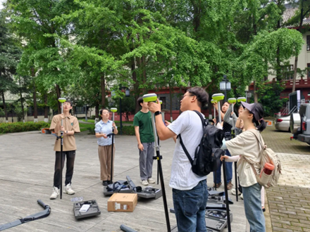 其次,工作人员向大家介绍天硕TS10 GNSS接收机的使用方法和手簿操作界面。先进行设备初始化设置,将接收机和手簿开机,打开T-Survey软件,使用NFC标志部分使得接收机和手簿进行触碰连接,也可通过蓝牙配对连接。然后新建项目,根据现场情况选择合适的坐标系统,并定位中央子午线。最后获取固定解,待手簿上方显示“固定”就可开始测量。天硕TS10 GNSS接收机不仅可以有点测量、点放样、直线放样、曲面放样、道路放样等多种功能,还可以满足坐标转换、坐标正算等多种计算需求。同学们仔细听取讲解,并上手操作,熟悉仪器。